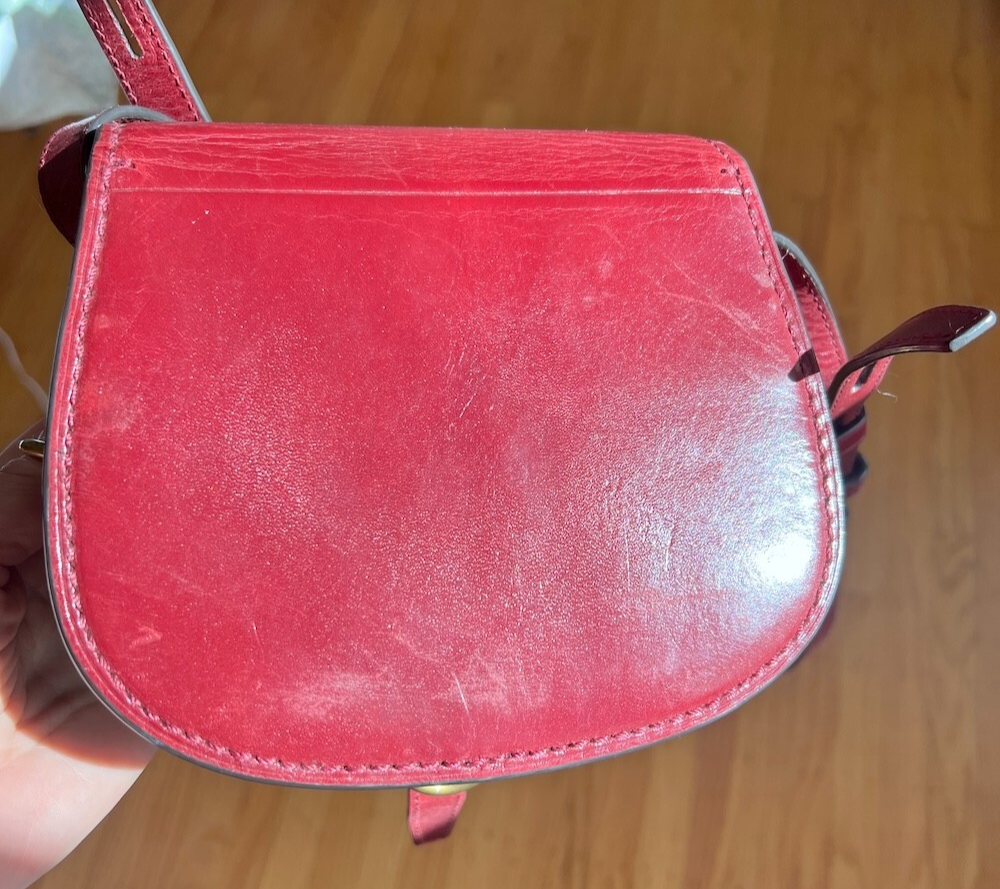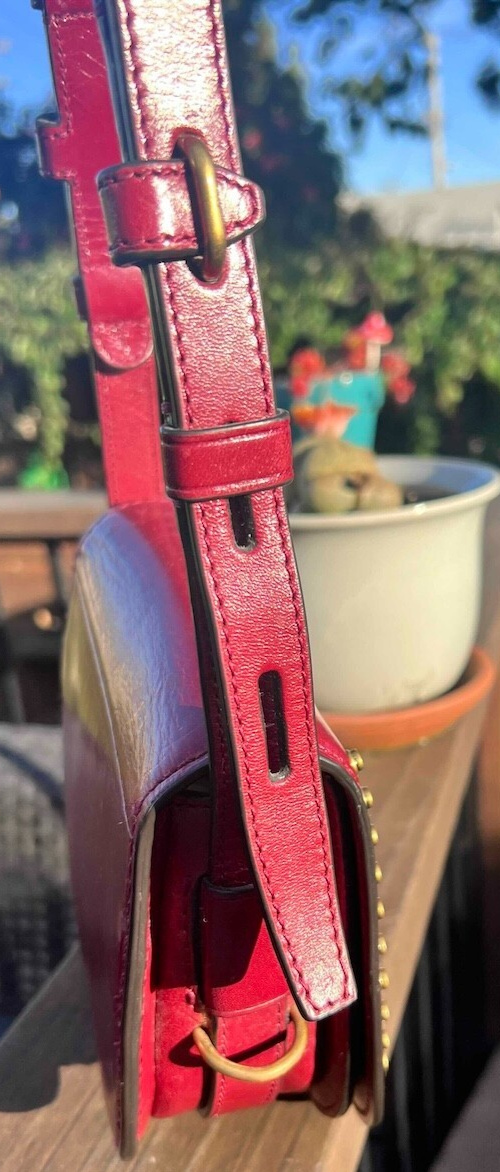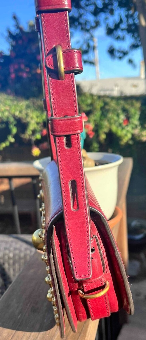 Meet your new favorite rare find! This authentic Tory Burch saddlebag channels major '70s vibes with its rich Red Agate leather , intricate Moroccan-inspired brass hardware , and stunning resin stone-like embellishments . It's one of Tory Burch's more decorative and luxurious pieces, originally retailing around $995. Perfectly sized for your essentials, it's as practical as it is stylish. Highlights: Rare and collectible Moroccan-style design High-quality Red Agate leather Generous brass hardware detailing Decorative resin stone-like embellishments Adjustable crossbody strap Secure magnetic flap closure Condition notes: Gently loved with minor scuffs and subtle creases, showcasing its authentic character. Brass hardware displays slight patina, enhancing its vintage charm. Interior clean and fully functional. Approximate Dimensions: Width: 8.5” Height: 7” Depth: 2.5” Adjustable strap drop: 22”-24” Originally retailed around $995—grab this rare Tory Burch piece for an incredible value! Shipping: Prompt, secure, and insured from California. Returns: Returns for this item accepted within 30 days (buyer pays return shipping). 💡 Questions? Message anytime—happy shopping! Tags: Tory Burch, Designer Bag, Moroccan, Saddlebag, Crossbody, Vintage Style, Rare Find, Brass, Resin, Bohemian