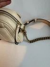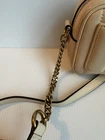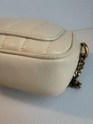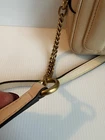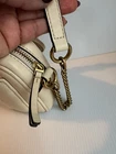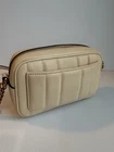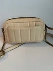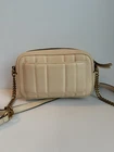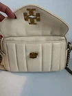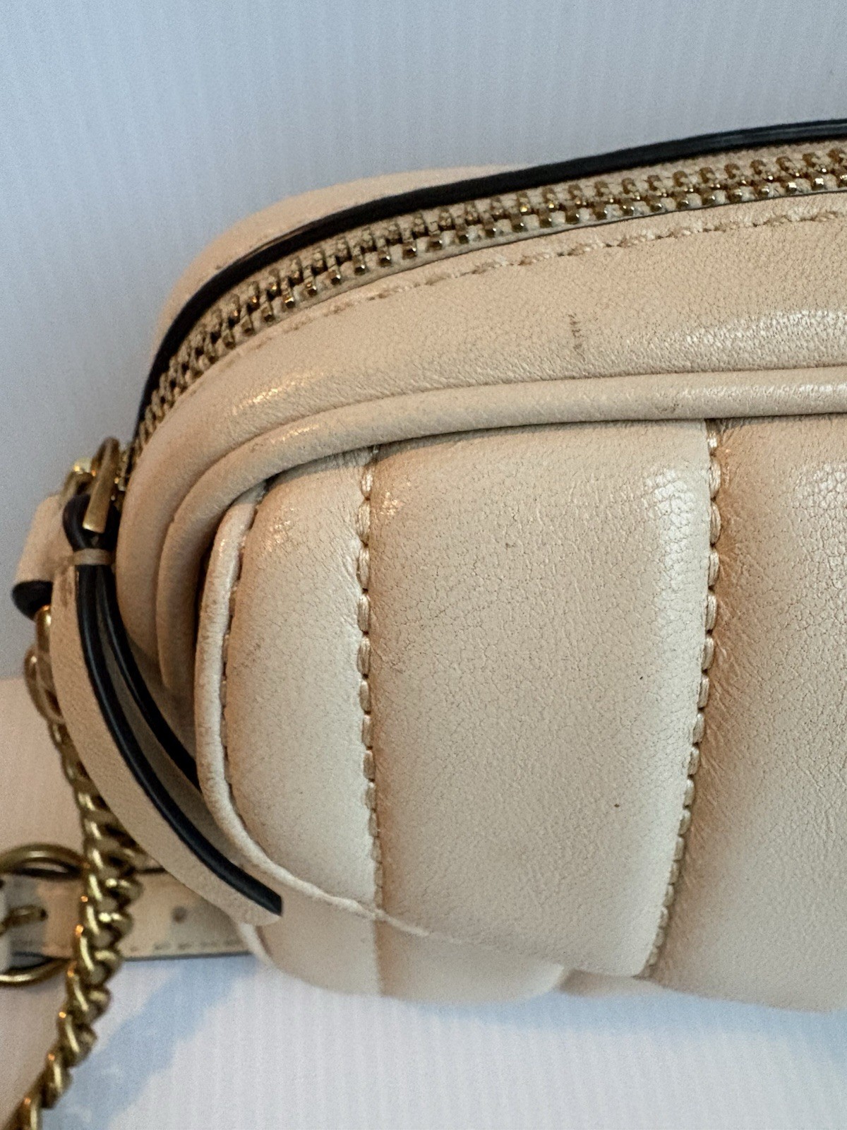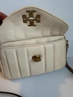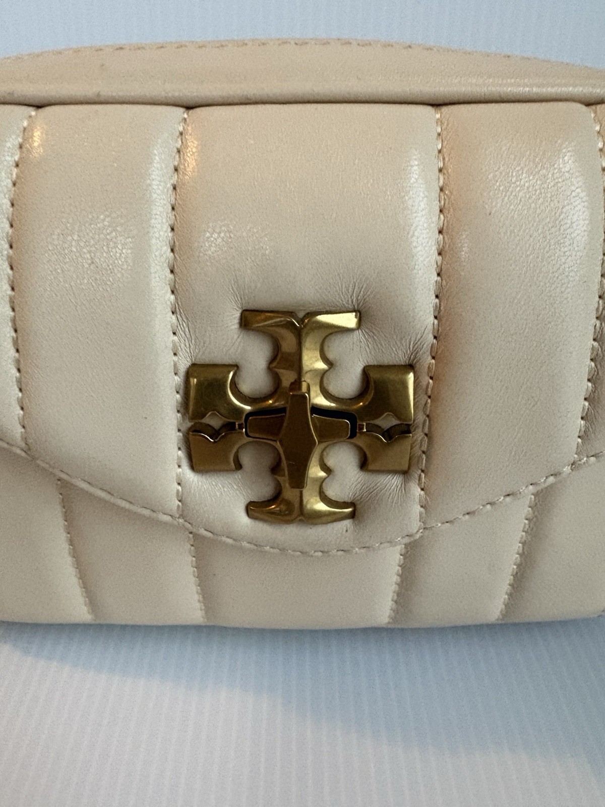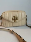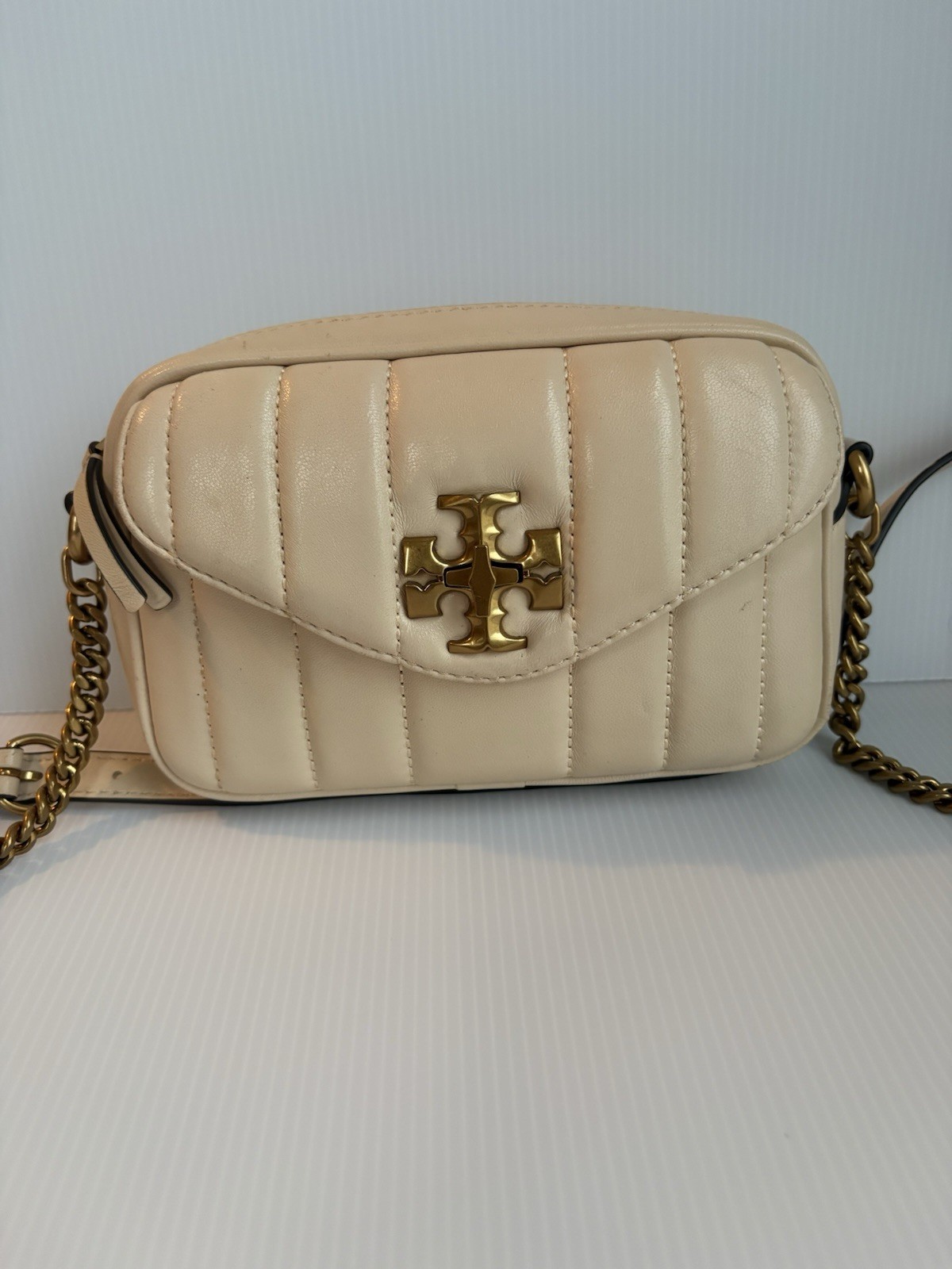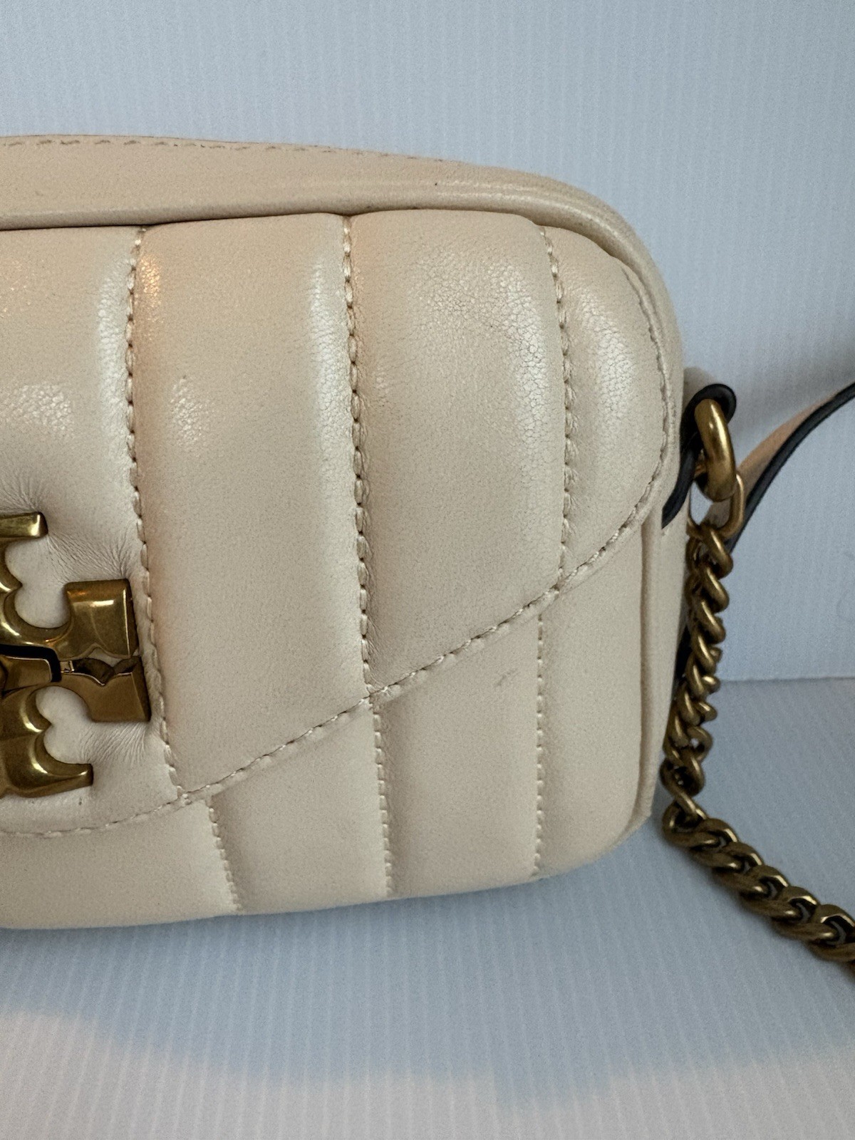 Tory Burch Kira Quilted Leather Camera Bag in a cream or "Brie" color with gold-tone hardware. It is a popular style known for its soft, quilted leather and the signature beveled Double T logo hardware on the front flap pocket. Product Details Feature Detail Brand Tory Burch Style Kira Quilted Camera Bag / Crossbody Material Napa Leather Color Cream, Brie, or Vanilla (off-white) Hardware Gold-tone or Rolled Gold Closure Top zipper and an exterior flap pocket with turn-lock closure Strap Adjustable chain and leather crossbody strap Size Typically "Mini" or "Small," fitting essentials like a phone, cards, and keys Bag shows some sign of use specially on corners… pls see photos before buying
