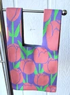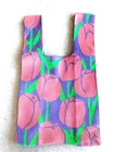 Great Looking Small/Medium Poly-Cotton Heavy Knit Tote Bag Pink tulips on Lavender background with Green leaves - Very cute and colorful! 2 Non-adjustable 5" straps Not a large bag, but generous inside space Overall: 8"x8" - bottom will expand 2+" as items are placed inside NEW Great gift for someone who likes special bags and totes!