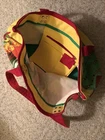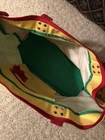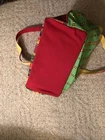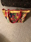large tote bags for women. Colorful tote bag, zipped at top with hard covered bottom, 2 cloth handles for shoulder carry Used without soil, tears, stains. Cloth handles have extra support with brads on handles to secure for heavy weight 12” tall 20 1/2” long Compartment insert sewed inside for loose items Heavy bright fabric for durability Interior material guards wet items