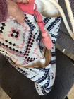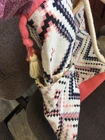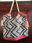 This tote bag is a unique and large women's accessory featuring a pink, purple, and ivory Aztec geometric print. The exterior is made of cotton with a knit woven texture, making it stylish and durable. The ivory lining complements the ivory handle/strap color, while the tassel color adds a pop. Ideal for carrying essentials, this tote combines a trendy design with functionality, perfect for adding a touch of bohemian flair to any outfit. A016