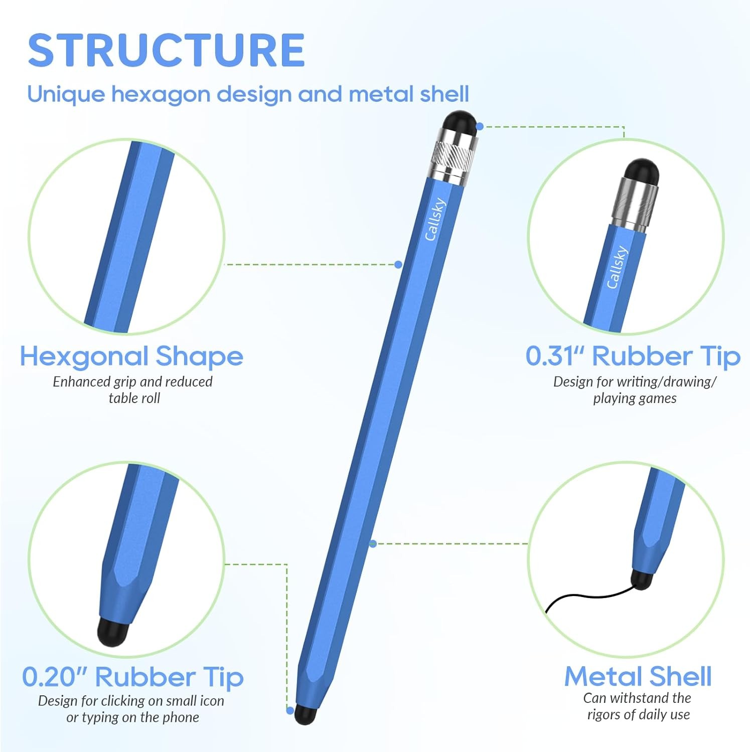 Stylus Pens for Touchscreen, 2 Size Rubber Tips Black/Green/Red/Pink/Blue Product Details Product Dimensions: 0.4 x 0.38 x 5.5 inches Item Weight: 4 ounces Manufacturer: Callsky-Tab Country of Origin: China Color: Black/Green/Red/Pink/Blue Brand: Callsky-Tab Material: Metal Item Weight: 4 Ounces Compatible Devices: Android Tablets, Iphone, Ipad Item dimensions L x W x H: 0.4 x 0.38 x 5.5 inches Are Batteries Included: No Batteries Required?: No Item Diameter: 0.4 Inches DESIGN FOR REDUCE WRIST STRAIN - Our stylus pen for touchscreen is crafted to fit comfortably in your hand, promoting a natural grip that reduces strain on your wrist during extended use HIGH ACCURACY & HIGH SENSITIVEITY - The fine tip of our fine tip stylus allows for greater accuracy when tapping keys on your device, reducing the likelihood of hitting multiple keys at once—common when using larger fingers HEXAGONAL BARREL & METAL MATERIAL - The hexagonal barrel prevents the stylus from rolling off desks or tables, ensuring it stays in place when not in use. This means you'll spend less time searching for it and more time being productive! Our alloy construction ensuring that your stylus pencils can withstand the rigors of daily use without compromising on performance. This means it’s built to last, supporting your creative and professional endeavors COMPATIBLE AND MULTI-PURPOSE - Universal stylus pen, perfect match with Callsky-Tab brand tablet and suitable for touch screen devices (Apple, Samsung, Moto, Lenovo, Xiaomi, etc.,. You can use our stylus pencil to write on drawing applications, take notes, read news, play games, etc., just like any other touch screen device EASY TO USE & REPLACEABLE TIP - Callsky-Tab stylus pen with rubber tip do not require charge and bluetooth connection. All tips are replaceable and finish the replacement process within seconds. Package contains 5* 0.20" replaceable rubber tips, 5* 0.31'' replaceable rubber tips. Simply unscrew the pen cap and replace rubber tips