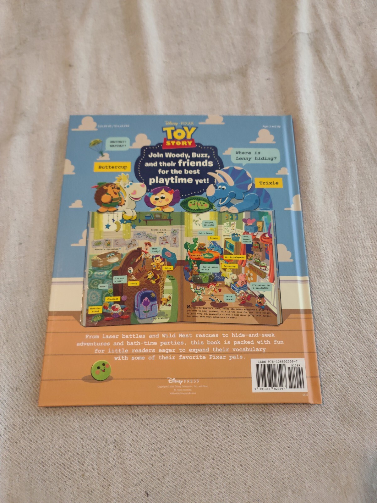 From Andy's room to Sunnyside Daycare and beyond, explore the world of Toy Story with Buzz and Woody in this illustrated, fun-filled picture book Featuring hundreds of objects and labels scattered throughout multiple playtime locations, little readers can expand their vocabulary with some of their favorite Pixar pals, making it a great reading tool for even the youngest Toy Story fan., From Andy's room to Sunnyside Daycare and beyond, explore the world of Toy Story with Buzz and Woody in this illustrated, fun-filled picture book! Featuring hundreds of objects and labels scattered throughout multiple playtime locations, little readers can expand their vocabulary with some of their favorite Pixar pals, making it a great reading tool for even the youngest Toy Story fan., Little explorers can travel through the worlds of Toy Story with Buzz and Woody in this delightfully illustrated and fun-filled picture book. Featuring hundreds of objects and labels scattered throughout multiple playtime locations, little readers can expand their vocabulary with some of their favorite Pixar pals, making it a great reading tool for even the youngest Toy Story fan.