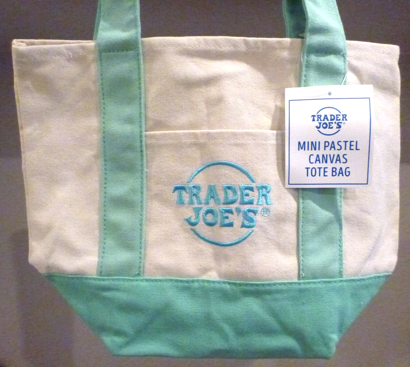 Trader Joe's Mini Pastel Canvas Tote Bag Natural Color Canvas Bag Green Bottom and Handles two outside pockets on both sides embroidered blue color store logo on both pockets size : 13"(L) x 11"(D) x 6"(W) material : 65% cotton, 35% polyester machine wash cold, lay flat to dry will shrink slightly product of Vietnam *Free Shipping in the US* Thank you for looking!