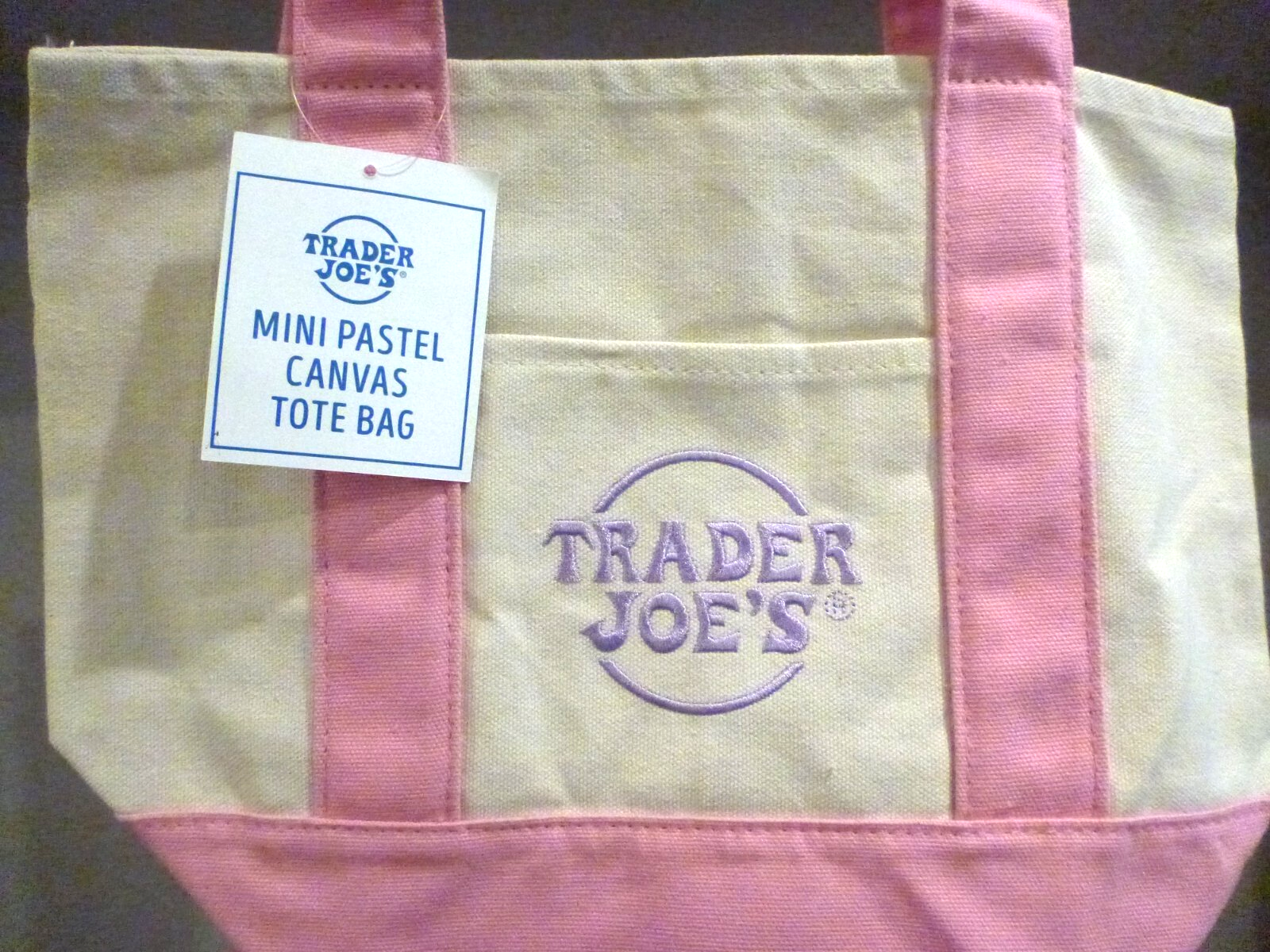 Trader Joe's Mini Pastel Canvas Tote Bag Natural Color Canvas Bag Pink Bottom and Handles two outside pockets on both sides embroidered lavender color store logo on both pockets size : 13"(L) x 11"(D) x 6"(W) material : 65% cotton, 35% polyester machine wash cold, lay flat to dry will shrink slightly product of Vietnam *Free Shipping in the US* Thank you for looking!