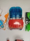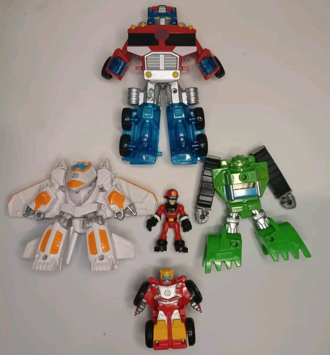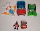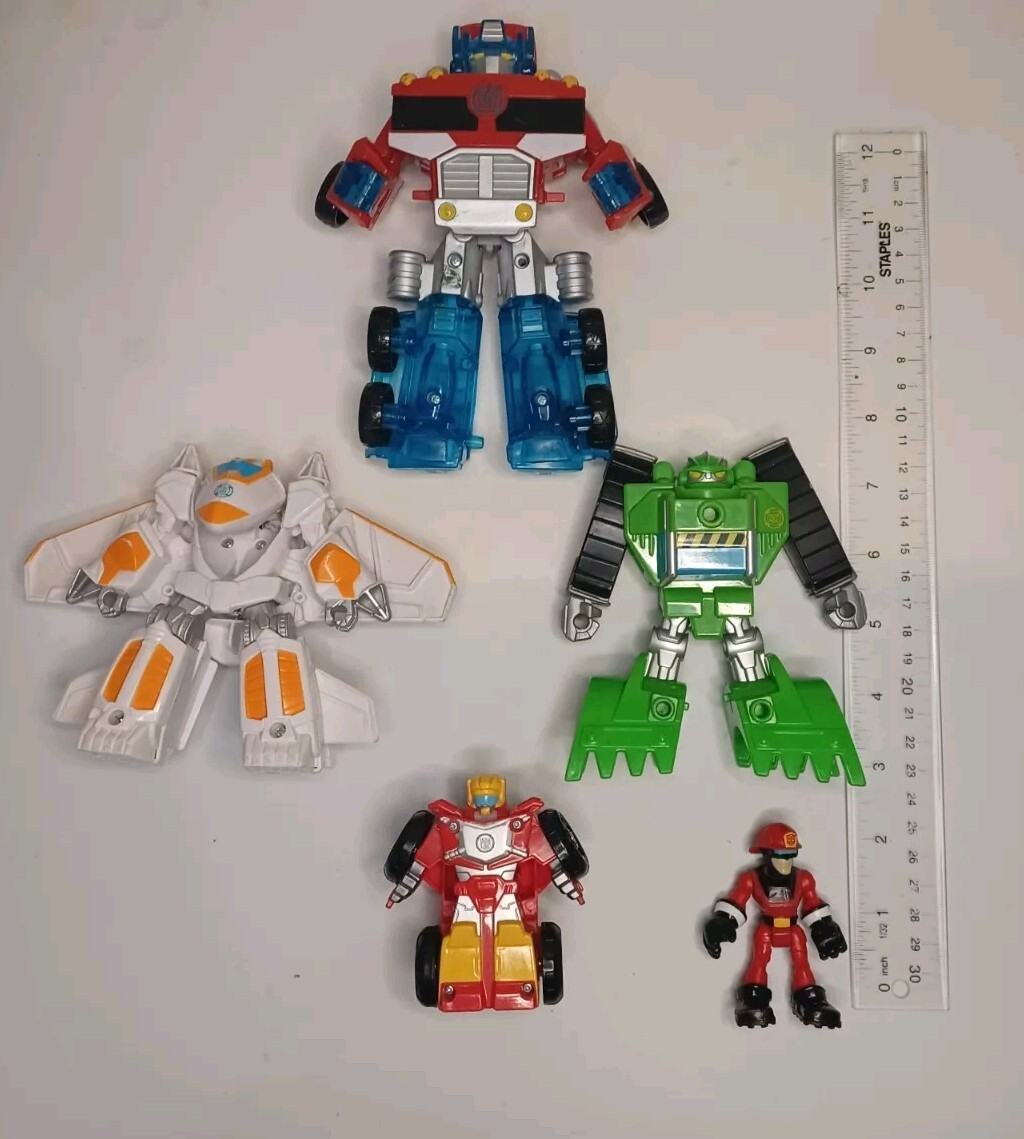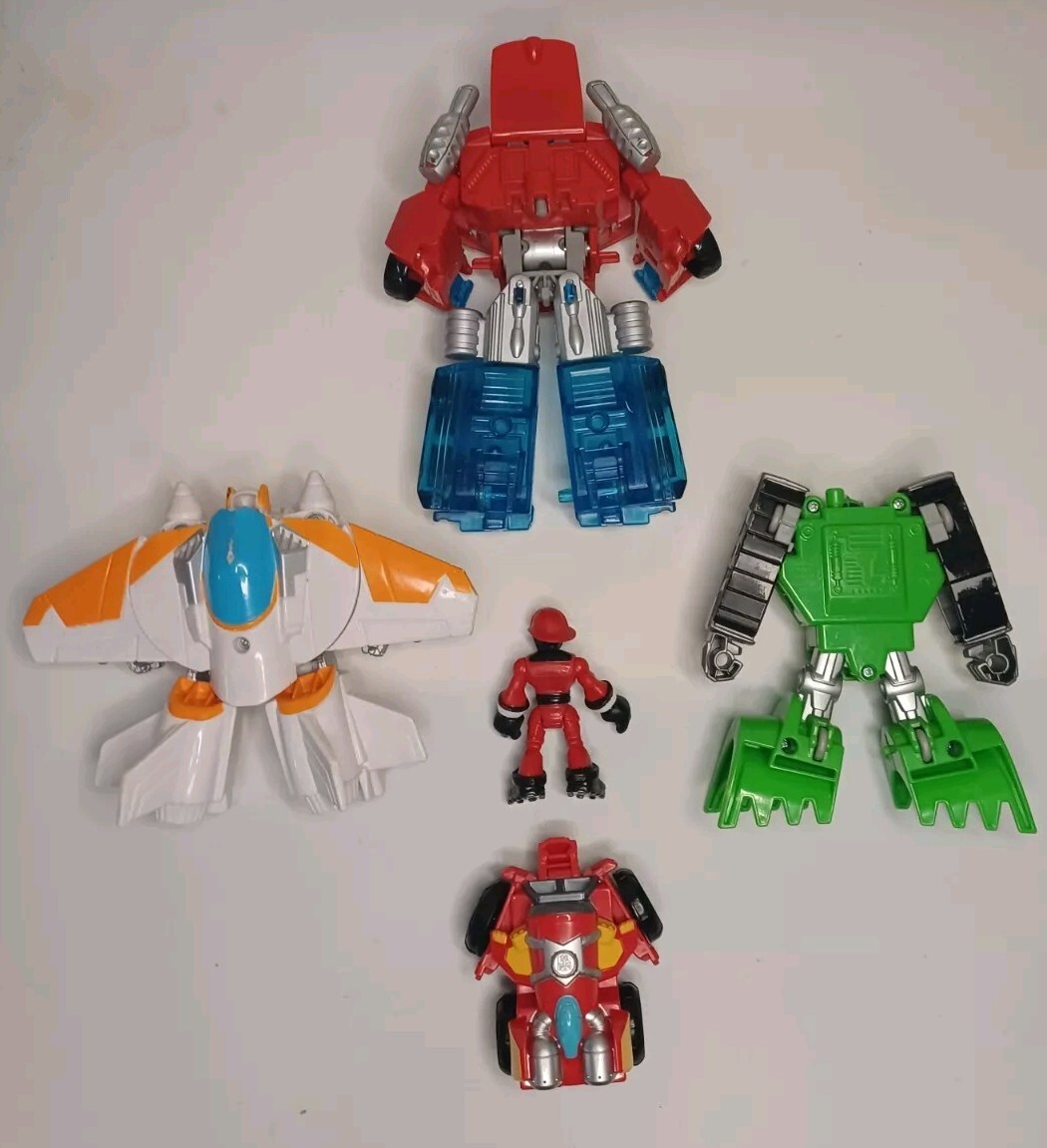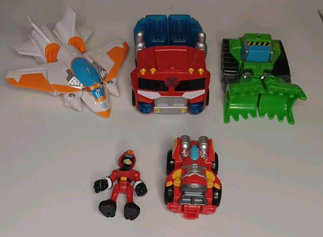 This lot includes five figures from the Transformers franchise, all made of plastic and featuring different characters such as Optimus Prime, Hotshot, Cody Burns, Rescan, and Blades is broken does not close right. These figures are part of the Transformers Rescue Bots series and were manufactured between 2010 and 2019. They are all licensed reproductions and can transform into different shapes, with Optimus Prime being able to transform into a truck and Blades into a jet.
