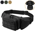 Feature: MULTIFUNCTIONAL GUN CASE-be able to put almost any full size pistols,4 magazines with accessory pocket.with the extra space for storing small item such as, scissors,knife,flashlight,etc. QUALTITY MATERIAL - Made from high-quality nylon material and nylon webbing, good wear and water resistance, strong corrosion resistance, which makes this tactical pouch perform better in the field. MOLLE SYSTEM DESIGN-Breathable mesh backing for comfort,removable and adjustable nylon web shoulder.Can be attached to a small bag, bag accessories, kettle, etc. Can expand the capacity to accommodate more items. MULTI-POCKET DESIGN-with a front zipper pocket, two sides zipper pockets, a back zipper pocket, a main pocket, a sandwich pocket.Main pocket - 17''L x 6''H x 2''W ; a front pocket - 7.3''L x 4.5''H x 1.2''W;a back zipper pocket - 7.9''L x 5.1''H; two sides zipper pockets front - 4.3'' x 5.1'' x 5.9''. EASY TO USE-Tactical storage gun bag ,Personal shoulder anti-theft bag ,Men's chest bag slung sports pocket.Perfect for indoors and outdoors: Running, Travelling, Camping, Hiking, Hunting, Cycling, sports, School Supplies, Tools, Etc. Specification: Material:nylon Type:Waist Pack Color:Black,Khaki,Army Green,C P Weight 0.3kg Size:25x15x15cm/9.84*5.90*5.90in Ocassion: Cycling Running Travel Climbing Hiking Fishing Hunting Package included: 1 x Waist Bag