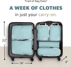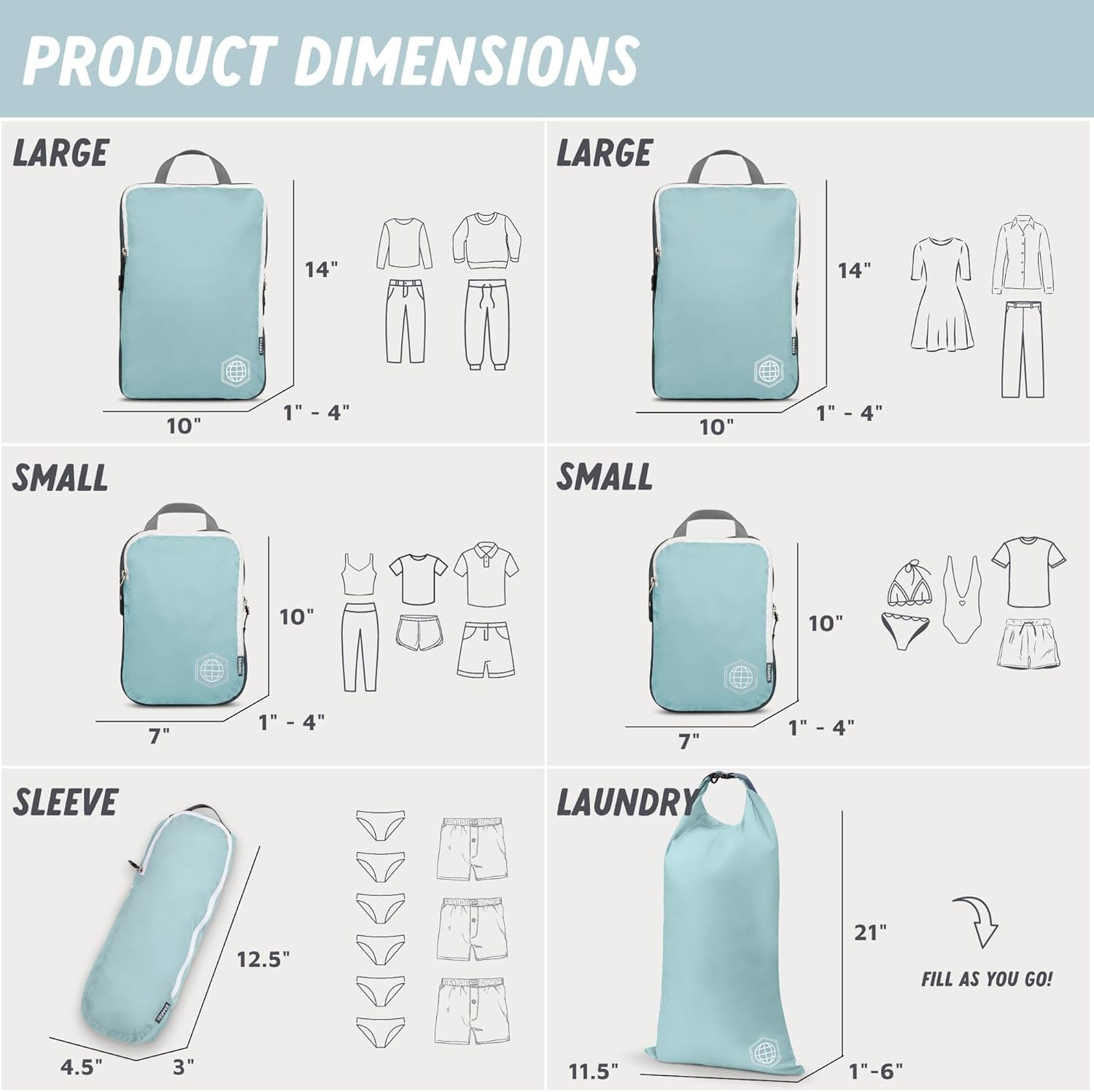 Store New Arrivals Add to Favorite View Feedback Contact Compression Packing Cubes for Travel- Packing Cubes and Travel Organizers Description Closure Type Zipper Item Dimensions L x W x H 10"L x 1"W x 14"H Number of Items 6 Brand Name TRIPPED Travel Gear Color Dusty Teal and White Brand TRIPPED Travel Gear Material Nylon Material Type Nylon Load Capacity 10 Pounds Number of Sets 6 Item Weight 11.8 Ounces Shape Rectangular Recommended Uses For Product Clothing, Camping Additional Features Lightweight Special Feature Lightweight Product Dimensions 10"L x 1"W x 14"H Size 6 Piece 210D Ripstop Nylon EASY TO USE! Compression packing cubes help you with packaging your clothes for upcoming trips by compressing the air out of them. These are not your typical vacuum bags-these expandable cubes use a two zipper system to help eliminate the extra bulk when packing your luggage. The zippers literally compress your clothes together and eliminate wasted space. Skip the extra fees of a checked bag- eliminate the bulk and use a carryon instead! LUGGAGE ORGANIZER! Compression packing bags are a packing essential for travel-especially useful as a backpack, luggage and suitcase organizer. Keep different outfits in separate compression cubes and always be ready for what’s next! Easily pack away clothing like raincoats/heavier jackets that are not used as often. Use empty cubes to pack dirty laundry in and keep your suitcase or backpack organized. TOUGHER THAN THE OTHER GUYS! Our ripstop Polyurethane fabric stands up to nonstop travel. It is ultra lightweight and durable and as well as being more reliable than even nylon alternatives for packing cubes. Additionally, polyurethane fabric is water resistant to help keep moisture out of your clothes wherever they’re packed. Zipper on the packing cubes all have reinforced zipper stops. Zippers used for expanding/compressing function of bags have been reinforced with double stitching as well. HOW MUCH DOES THIS SET HOLD? Each set contains a different assortment of packing cubes. Large bag holds a week worth of shirts/ medium holds a week worth of underwear/socks. Example: Large holds rainjacket, zip hoodie, Longsleeve tshirt, and a cardigan. Small will hold 5 womens size medium tshirts. Large Dimensions Compressed size: 14x10x1in Expanded Size : 14x10x4in Small Dimensions Zipped/Compressed size 10x7x1in Expanded Size: 10x7x4in Additional bag sizes shown in picture gallery. SATISFACTION GUARANTEED! We make the best packing cubes, luggage organizers, and travel accessories possible at a fraction the cost of the competition. If you're not happy with your purchase, we'll replace or refund you immediately! We stand behind the fact these are the perfect travel accessories for your next hike, cruise, RV, camping trip or backpacking trip around the world. Product Description 1 Colors 2 How to use 3 Product Dimensions The video showcases the product in use. The video guides you through product setup. The video compares multiple products. The video shows the product being unpacked. 1 The cubes 2 Large Cubes 3 Small Cubes 4 Cinch sack 5 Tube cube SHOP THE RANGE Suitable trips Business trips, weekend getaways, overnight stays Suitable trips Weekend getaways, 1 week vacations, avoiding checked bag fees Suitable trips 10 Day+ vacations, winter clothing, plus size clothing What fits? 3-5 days outfits, formal wear What fits? 5-10 days outfits What fits? 7-14 days outfits, XL clothing, bulky clothes How many cubes? 2 How many cubes? 6 How many cubes? 7 Machine washable Yes Machine washable Yes Machine washable Yes ABOUT US We offer the best prices around on high quality products. Our E-store includes media such as books, movies, music and games while offering electronics, toys, sporting apparel, clothing, tools, general home, garden items and more. SHIPPING We are always working hard to ensure your package arrives as soon as possible. Please understand that some factors like weather, high postal traffic, and the performance of shipping companies are outside of our control. We offer free shipping to the lower 48 states and ship within 2 business days of payment, usually sooner. We do not accept P.O. Boxes. Please provide a physical address. RETURNS We offer a 30-Day Return Policy on items which you are not completely satisfied with. You have the option for a full-refund or an exchange of the item. No returns are available on items shipped outside of the USA. PAYMENT We accept PayPal. CONTACT US This page content is yet to come Please ad us to your favorite seller and visit again later Thank You CUSTOMER SATISFACTION We try our very best to make sure every customer is completely satisfied. If there's a problem, message us! We're happy to help.