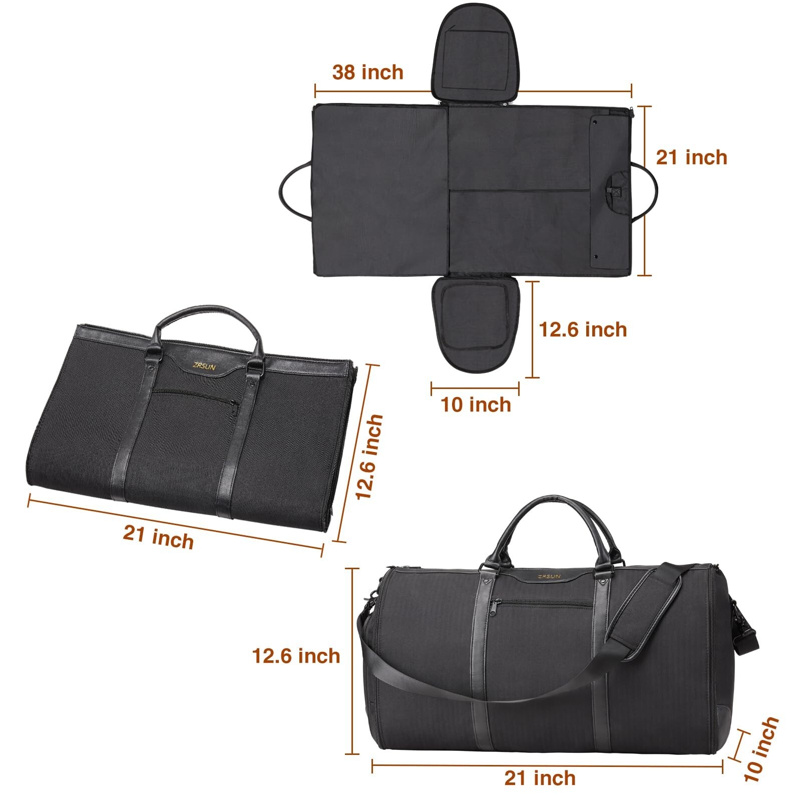 Garment Bags for Travel, Carry-On Suit Bag, Convertible Garment & Duffel Bag with Shoe Compartment, Perfect for Business Trips & Weekend Getaways, Blue Product Details Product Dimensions: 21 x 10 x 12.6 inches Item Weight: 2 pounds Department: Unisex Adult Manufacturer: ZRSUN Country of Origin: China Item model number: 01 3 IN 1 Garment Travel Bag: The JENNI BAG is a real game-changer! It's a 3-in-1 wonder that combines a GARMENT BAG FOR TRAVEL, a TRAVEL DUFF BAG, and a shoe bag. Picture this: you're on a business trip and need to look sharp. This bag keeps your suits wrinkle-free with its water repellent polyester and non-slip metal zippers. It's like having a personal wardrobe assistant on the go No Wrinkle Design:The GARMENT BAG is made of durable water repellent polyester and features non-slip metal zippers that are scratch and water-resistant. It's like a shield for your clothes, keeping them clean and wrinkle-free throughout your journey Multi Compartment:The TRAVEL DUFF BAG offers multiple compartments. There's a main compartment for larger items and various pockets for organized storage. The separate shoe compartment keeps your shoes away from clean clothes. It's like having a mini organizer in your bag, making it easy to find what you need Large Capacity:With a spacious 50L capacity, the TRAVEL GARMENT BAG is perfect for week-long trips or a couples' weekend getaway. It's like a magic bag that can hold all your essentials and more. Whether it's clothes, shoes, or small items, this bag has got you covered. It's your reliable travel companion Easy To Carry:The JENNI BAG is easy to carry. It meets airline carry-on requirements and can be carried by hand or cross-body. Whether you're on a plane, train, or bus, it's like a trusty sidekick that's always there for you. Ideal for business trips, weddings, and formal occasionsoccasions Garment Bags for Travel, Carry-On Suit Bag, Convertible Garment & Duffel Bag with Shoe Compartment, Perfect for Business Trips & Weekend Getaway