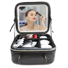 Product Specifications: Item Type: Travel Makeup Bag with LED Lighted Color: Black. Size: 10.6 x 9.8 x 4.6 inches Material: ABS & PC Functions: Makes messy desktops more tidy and saves space on the desktop Quickly find the required cosmetics and reduce the time for makeup Built-in LED light makeup mirror, providing appropriate lighting Package Include: 1x Travel Cosmetic bag 1x Detachable Mirror with 3 color light adjust brightness 1x Brush Storage Board with Cover 1x USB charging cable TOP QUALITY MATERIALS: This Makeup Bag is made of high quality ABS&PC material, lining-nylon, which has a strong load-bearing and anti-pressure ability to protect your cosmetics and the mirror from damage. And it also can be waterproof, dust proof, wear resistance and easy to clean. Ergonomic handle, double metal zippers are easy to open and close with one hand. COSMETIC CASE WITH LED LIGHT: We installed a makeup mirror with light on the make up bag. The led light has three colors that can be adjusted, namely white, yellow, and mixed color, and the brightness can be adjusted at any time. It is very suitable for use when making up, and has the charging function. It is especially suitable for travel without power supply. PORTABLE MAKE UP CASE SIZE: The size of this large-capacity makeup box is 10.6 x 9.8 x 4.6 inches. When you travel, you can organize a variety of makeup tools. This makeup carrying case is sturdy and durable, with exquisite synthetic leather finish, waterproof and wear-resistant, ergonomic handle, safety lock, aluminum metal hinge, and corrosion and wear resistance. Adjustable compartment: Our cosmetic train box is equipped with 5 detachable EVA dividers and 10 cosmetic brush slots, which can accommodate a variety of cosmetics and cosmetic brush specifications and meet your needs for various combinations. There is a layer of anti-dripping sponge pad on the surface of the partition, which can well protect the cosmetics inside and ensure that they will not crack or leak. PERFECT GIFT: Travel makeup case with LED Lighted is one of a perfect gift for her. AS makeup organizer box it can store not only cosmetics, but also jewelry, electronic accessories, cameras, essential oils, cosmetics, shaving tools, valuables, etc. This volume of Makeup Case is convenient to carry and does not take up space. You and your family need this makeup organizer case very much when traveling.