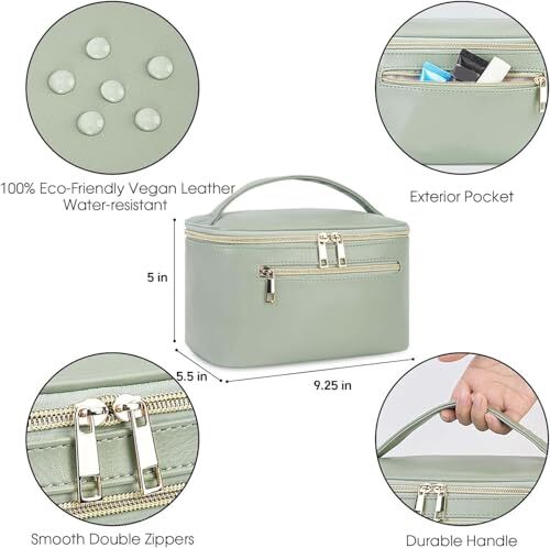 Vegan Leather: This cosmetic bag is made of premium vegan leather and has all of the comfort, softness, and water-resistant that you love. Also, well-padded design of makeup bag organizer provides great protection performance. Separate Brushes Compartment: The top flap includes 6 slots with clear make up brush cover with velcro tape for storing more than 10 different size of brushes while traveling. And the clear cover is easy to clean & protect brushes from dust. Roomy Interior Organization: A large opening with top durable handle offers convenient packing and easy to carry. Interior outfits 6 side wall elastic cords and 3 side wall pockets, that build a spacious main compartment for storing travel sized cosmetics & bottles organized. And, exterior features a front zipper pocket (Length 6.2 inch) to keep other small beauty tools separate, clean and easy to access. Overall Dimensions: 9.4 x 5.5 x 5.5 inch, weight 0.57lb, which is large enough to hold all the essentials for a weekend trip or daily use. This organizer case easily fits travel-sized toiletries or full-sized skin-care products such as lipstick, lotion, facial cleanser, make up remover, foundation, concealer, eye shadow, powder etc. Travel Must Haves & Cute Gift: This make up bag will perform as a travel makeup bag, an at-home makeup organizer or makeup storage case. It is great traveling accessories and wonderful gift for women(Patent Pending).