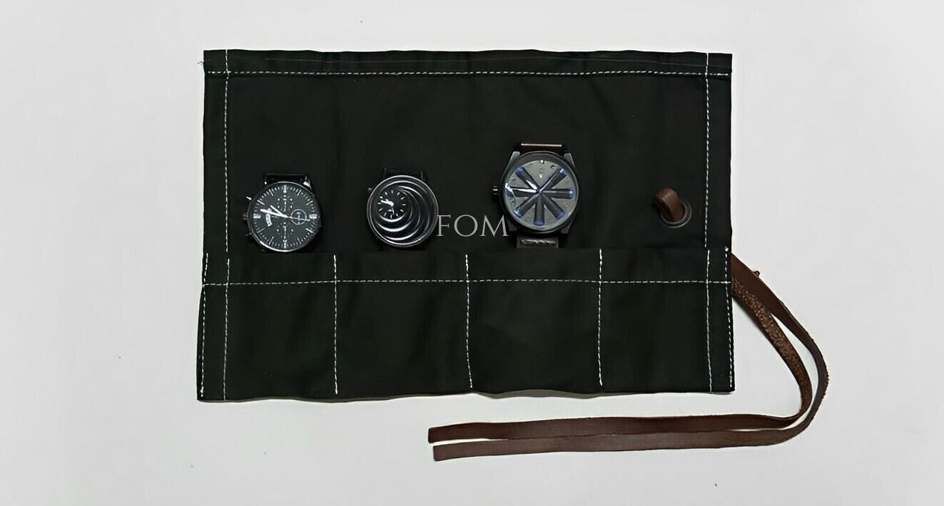 Watch Roll Canvas Display Case Travel Pouch Roll Stylish travel watch roll keeps your watches safe and organized. It is made from high quality premium Leather making it the perfect watch display case. Leather watch case is the light weight and easy to carry. This is the perfect X max Gift for watch lovers. FEATURES ● This Watch roll is crafted by our skilled craftsmen from finest quality Canvas. ● Available Colours: Green & Dark Khaki ● Dimensions: Length: 12" & Width: 8.5" ● 4 pockets for your watches. ● 1 leather loop to tie the roll. ● Each pocket is 3 inches wide & 3 inches deep. (Approximate) ● It provides reliable protection for the clock face from scratches. ● Easy to carry. ● Strong stitching all around this case for durability. ● Protect your watches from scratches. NOTE This listing is only for 1x Watch roll case. (Watches not included) SHIPPINGS & POSTAGE Please allow us for 1 to 2 working days to dispatch. PACKINGS All the contents are packed in discrete packing. REFUND POLICY If you are not completely satisfied with your purchase, you shouldn't worry at all, simply return us the product in its original condition in order to receive the 100% refund.