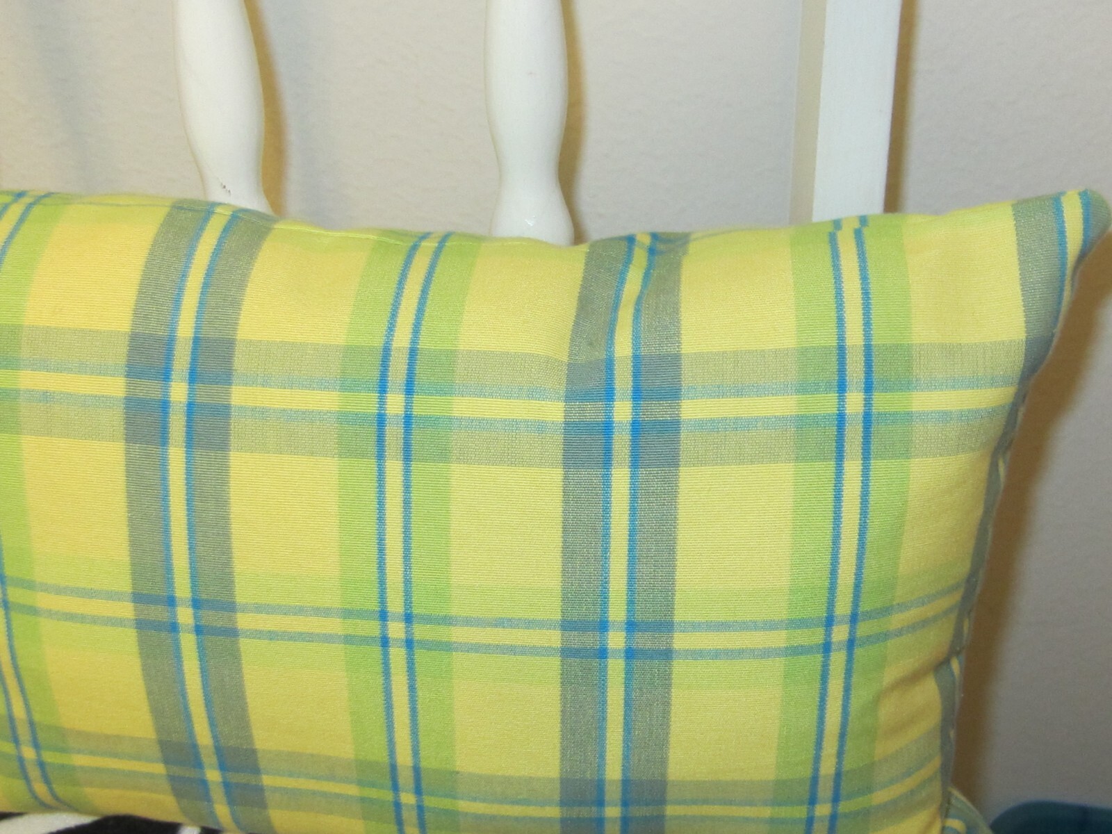 This is a handmade travel pillow with blue green sea turtle painted with acrylics. Measures 8" x 12" Stuffed with polyfil Cotton plaid fabric on both side.