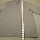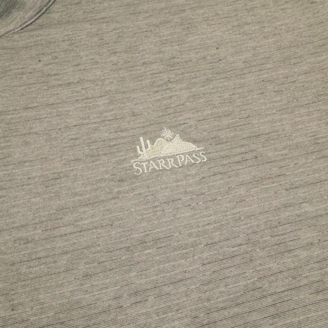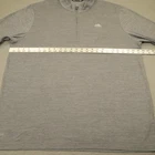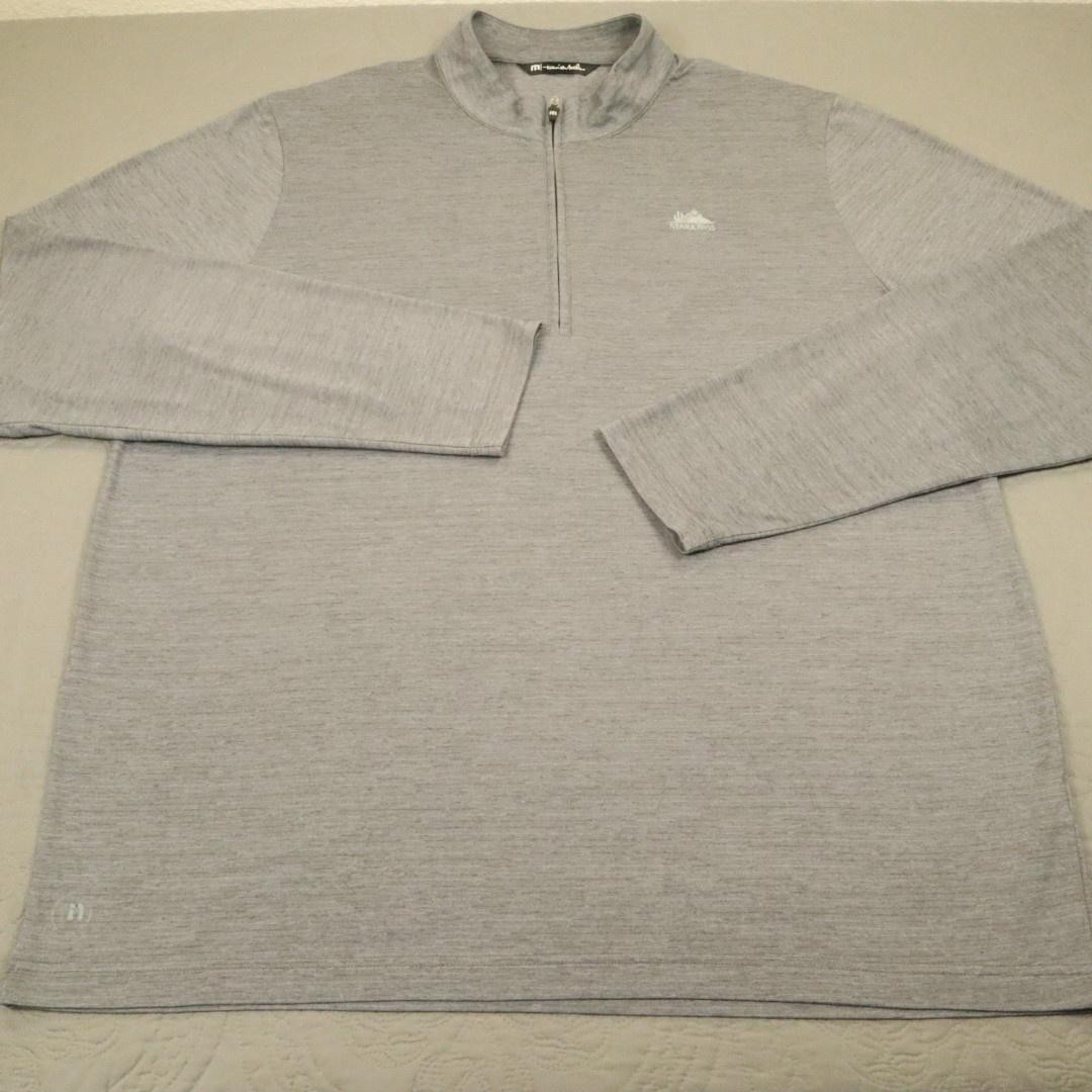 Brand: TravisMathew Style: Mens long sleeve 1/4 zip golf pullover with mock neck and straight hem. Color: Heather gray. Graphic details: White embroidered Starr Pass desert and mountain logo at left chest and small TravisMathew logo at front hem. Size on tag: Mens 2XL Material: 70% polyester, 23% cotton, 7% spandex.