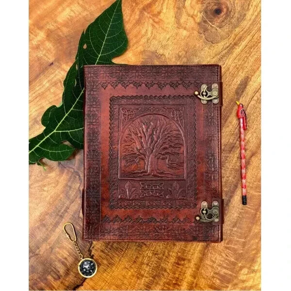 This stunning leather journal is adaptable to use as a memory journal, sketch book, manuscript books, etc. This embossing journal is adorned with detailed leather. It is perfect for classic calligraphy and scripting - a true conversation piece. Indulge yourself to write poetry, spill your heart and soul out onto the handmade fiber page, or use as guest book / Instagram photo book. Guest book: The blank handmade paper is very unique and perfect for guest/wedding books. Instagram Photo Book: It can also be used to show off your favorite Instagram images in this handmade leather book by using acid-free scrape booking adhesive or double-sided tape. Overall Length: 13 by 10 inches Pages: 200 pages (counting both sides) Paper Type: Handmade Antique paper Cover: Genuine Cow Hide Leather with Leather Metal Closer Design: Detailed Tree of Life Embossed and leather Whether you’re a mom balancing a family with tons of appointments, a business professional who needs to remember details meetings, or you just want to keep your notes and thoughts collected, this Leather Journal comes with all the style, comfort, and versatility you need to be at your best The leather is produced using traditional methods, which allows it to retain its character. This means that each journal is unique and comes with its own set of beautiful creases, bumps, and marks that develop with age into something truly special. The leather is protected with natural oils to give it a lovely rich finish .