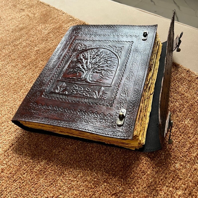This stunning leather journal is adaptable to use as a memory journal, sketch book, manuscript books, etc. This embossing journal is adorned with detailed leather. It is perfect for classic calligraphy and scripting - a true conversation piece. Indulge yourself to write poetry, spill your heart and soul out onto the handmade fiber page, or use as guest book / Instagram photo book. Guest book: The blank handmade paper is very unique and perfect for guest/wedding books. Instagram Photo Book: It can also be used to show off your favorite Instagram images in this handmade leather book by using acid-free scrape booking adhesive or double-sided tape. Overall Length: 13 by 10 inches Pages: 200 pages (counting both sides) Paper Type: Handmade Antique paper Cover: Genuine Cow Hide Leather with Leather Metal Closer Design: Detailed Tree of Life Embossed and leather Whether you’re a mom balancing a family with tons of appointments, a business professional who needs to remember details meetings, or you just want to keep your notes and thoughts collected, this Leather Journal comes with all the style, comfort, and versatility you need to be at your best The leather is produced using traditional methods, which allows it to retain its character. This means that each journal is unique and comes with its own set of beautiful creases, bumps, and marks that develop with age into something truly special. The leather is protected with natural oils to give it a lovely rich finish .