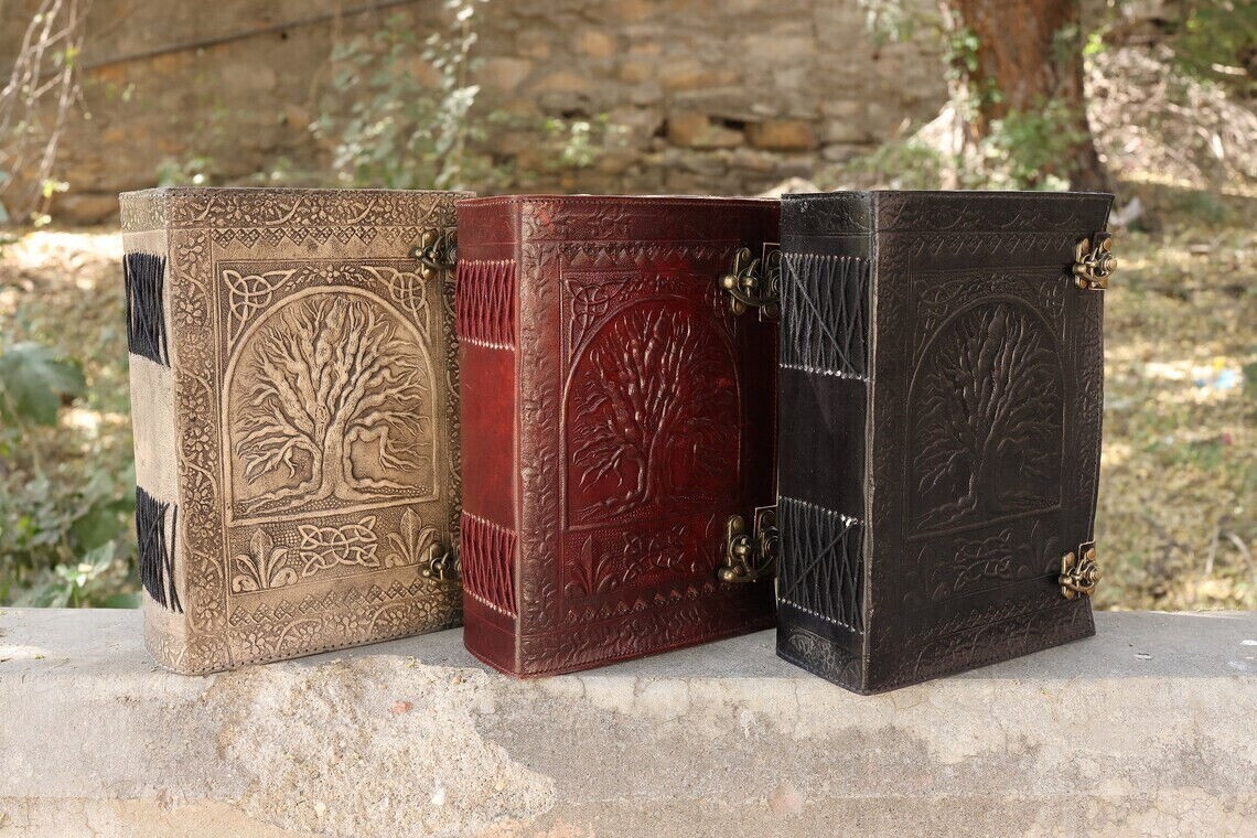 Journal Tree of life leather journal Notebook Writing Journal With Tree of Life refillable notebook Gift For Valentine's day Men & Women Handmade Large Tree of life Journal made from cow hide leather. This notebook tree of life entirely done by hand embossed. Tree of life leather journal notebook with blank paper are fixed with a removable string binding which make it possible to replace with the new paper once used. Provided with 310 sheets of paper ( 620pages counting on both side). Leather journal notebook can be use as a personal journal for writing, journal to write in, leather notebook, spell book, sketchbook, drawing, travel notebook, daily notepad, leather dairy, story writing, vacation journal. Perfect for gift - Suitable for men or women Celtic Embossed tree of life leather journal is perfect for gift Christmas, New year, family members, your loved once, relatives, occasions, celebration, festivals. Color : Brown, Black, Beige Size: Length - 7" Width - 4" Height - 10" Inches