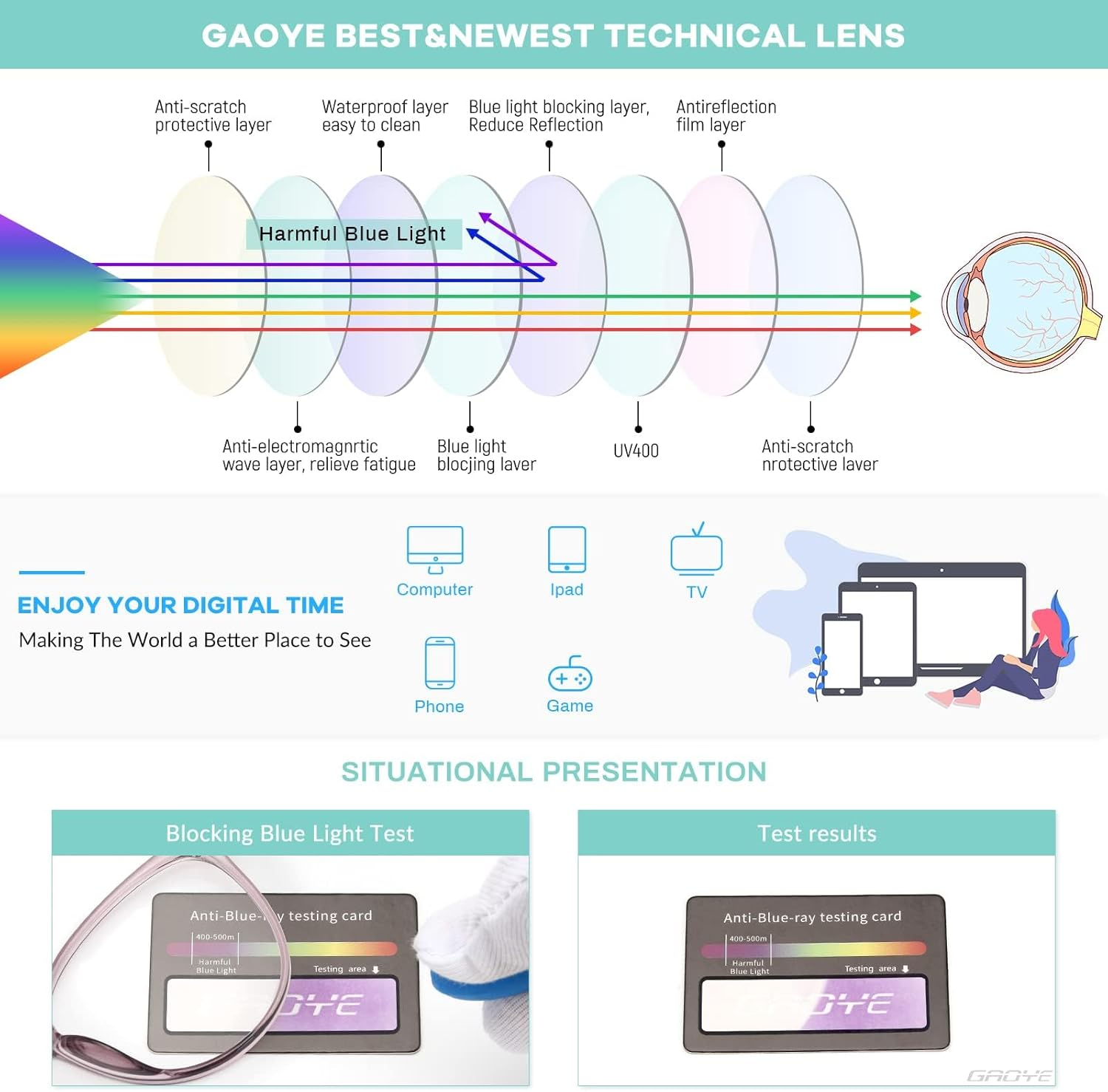 Menu Other Items Feedbacks About Us Contact Us Add To Favorites Blue Light Blocking Glasses - Trending round TR90 Frames, Metal Arms, UV400 Protection - Matching Soft Case [Anti Blue Light Glasses] Blue light blocker with UV400 lenses help you block 99% harmful blu ray & UVA/UVB, which must have for tv, video, pc, phone or other digital screen. Reduce eye strain, headache(migraine), glare and dry eye, protect your eyes and help sleep better [Lightweight TR90&Metal Frame] Extremely durable and super light, you can barely feels its presence, suitable to wear for a long time. Cute retro round style, also a great gift idea [Flexible Spring Hinge Design] Suitable for all face type. The spring leg can be expanded up to 15°, which reduces the squeezing of the glasses to the head. Good protection for your face [Anti Reflective HD Lens] Scratch resistant, non prescription. Amber tint, close to clear lens, no color difference [Worry-free Shopping] Any problem with our eyewears, just contact us without any hesitation to solve the problem until you are satisfied. You have no risk to try Product Description The GAOYE brand was founded in Milan in 1997 by the Italian company HTW. The founder was visual protection expert and family fashion designer Alessandro, who good at designing and creating fashion luxury. The GAOYE brand mainly develops and designs stylish sunglasses, outdoor sports sunglasses, blue light blocking glasses & reading glasses. GAOYE adheres to the avant-garde fashion design concept and pays attention to visual health protection. Our mission is to bring you a healthy and wonderful visual experience! GAOYE premium blue ray cut lens, safeguard your eyes and anti digital eyestrain from screen time so For better work and better life, brings you enjoyment of digital life. What You Get From Gaoye glasses? √ Blue ray blocking -- with American HEV-Adsorb substrate absorption technology, Gaoye lenses can absorb 95% of high-energy blue light. √ UV protection -- Anti-Blu-ray Lenses utilize special U.S. substrate processing technology to protect the eyes from ultraviolet rays. √ Clear lens -- The lens was made of a fully transparent base, without any pigment, while maintaining high light transmittance. Less reflective,no affect reading, and almost no color difference. GAOYE Blue Light Blocking Glasses: Focus on Digital Life Anti eye fatigue & headache Long time exposure to blue light would lead to digital eye fatigue. Wearing your blue light glasses, no more tired eyes. Reduce eye strain and sensitivity to light when facing digital screens. Great for office workers or anyone who has to look at screen all day. Minimize headache Do you suffer headaches from long time screen time? Gaoye blue light blocking glasses will supercharge your health by blocking detrimental blue light while letting in all other beneficial light. Better Life Exposure to high rate blue light will impact our sense of circadian rhythms and wreck our internal rock, then cause insomnia. Wearing Gaoye blue light filter glasses will improve your sleep, help you sleep better and feel good everyday! Item Specification Item model number 1696 Color 1-leopard/Transparent Lens Lens Color Clear Department unisex-adult Is Discontinued By Manufacturer No Package Dimensions 6.26 x 2.52 x 1.65 inches; 4.66 ounces SHIPPING FREE FAST SHIPPING FREE SHIPPING We are always working hard to ensure your package arrives as soon as possible. Please understand that some factors like weather, high postal traffic, and the performance of shipping companies are outside of our control. We offer free shipping to the lower 48 states. We do not accept P.O. Boxes. Please provide a physical address. If you have a problem or question regarding your transaction please contact us immediately. We will work with you to resolve any problem you may have. Thank you