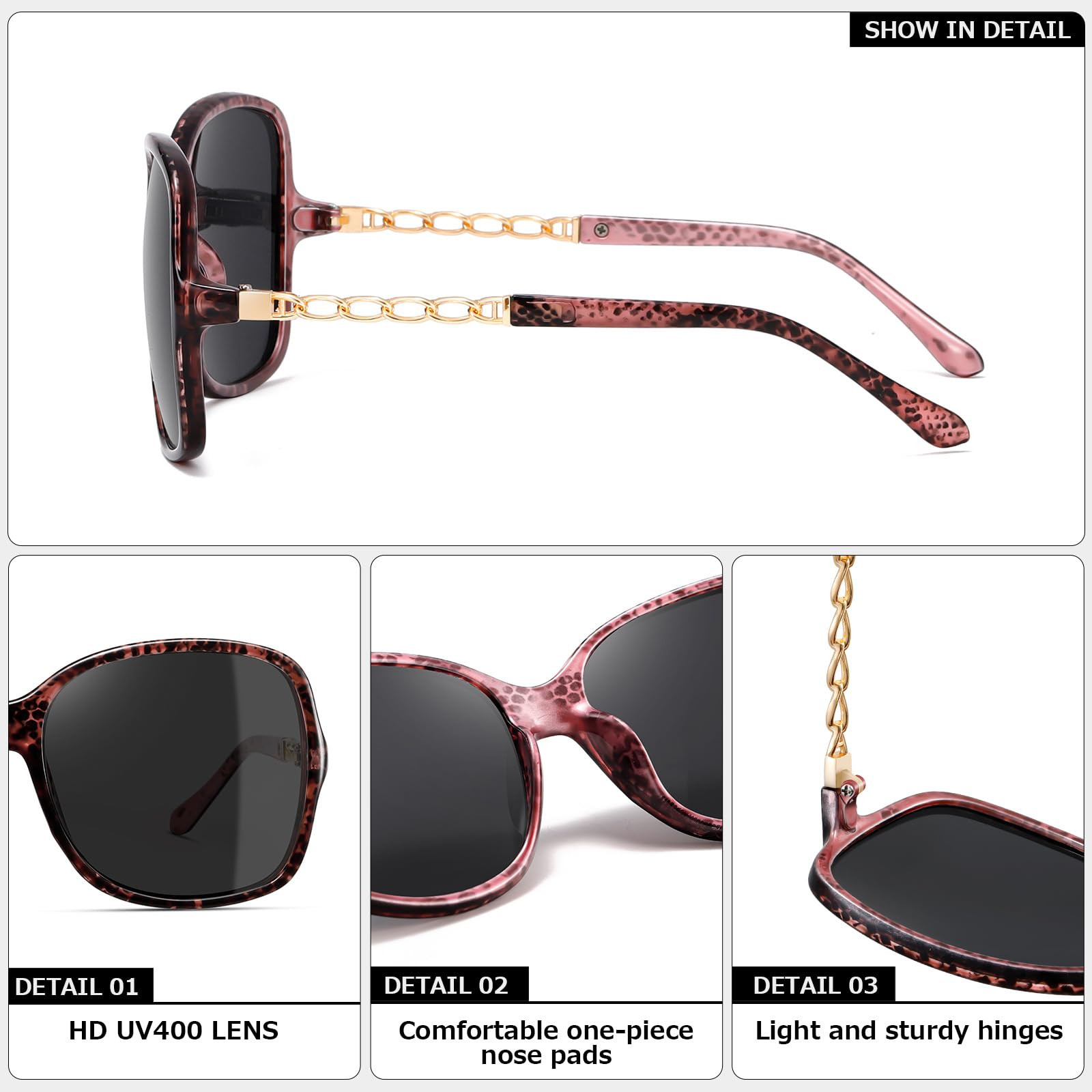 FASHION BIG FRAME SUNGLASSES: Classic oversized frame with pretty colors lets you look elegant. Large Square ladies sunglasses provide more eye protection and mysterious charm. Show your fashionable style while driving, hiking, fishing, cycling. METAL CHAIN DESIGN:The metal chain design makes the sunglasses fashion and special.The sturdy composite frame, lightweight but durable, not easily deformed. All the details ensure long time using. ADAPT TO MULTI OCCASIONS: The UV400 sunglasses womens can block 100% harmful UVA, UVB rays, suitable for various outdoor activity, such as shopping, driving,taking a sunbath and so on. PACKAGE INCLUDES: Sunglasses*1,PU leather sunglasses case*1, cleaning cloth*1,sunglasses box *1. It is gift packaged ready,making it a good festival gift choice. STYLISH GIFT: Chic gift packaging presents sunglasses, a soft box, a bag, a lens cloth and a testing card. The lightweight plastic frames bestow an ultra-comfortable wearing sensation. A splendid gift option for friends and family!