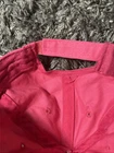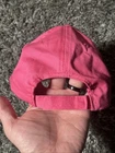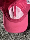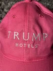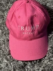 This is a pink and white adjustable baseball cap embroidered with the Trump Hotels logo. The cap is made of cotton twill and features a solid pattern. It is suitable for travel and casual occasions, and is available in one size that fits all unisex adults. The cap is part of the Trump brand and has a colorful theme. It is perfect for all seasons including winter, summer, fall, and spring. The cap is pre-owned and is in excellent used condition.