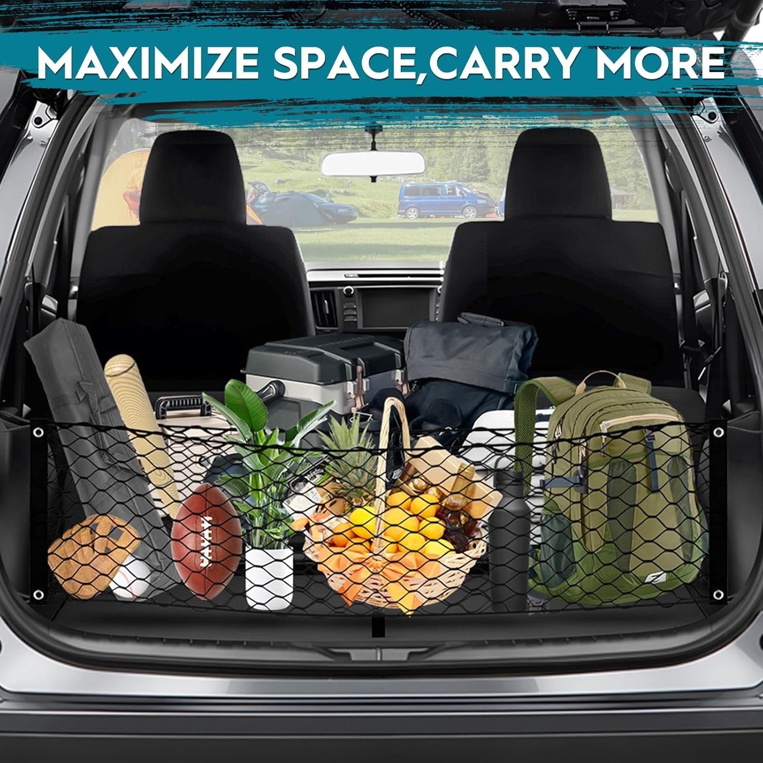 About this item Cargo Net for RAV4: This trunk mesh cargo net is compatible with 2013-2018 RAV4. It perfectly fits your vehicle and is easy to load and unload items. Double Layer Mesh Design: The double layer mesh design of the cargo net offers enhanced security and organization for your belongings. Keep your groceries, sports equipment, and luggage securely in place during travel. Enhanced Organization & Stay in Place: With this cargo net, you can efficiently organize the items in your trunk or back seat. No more items sliding around or spilling during sudden stops or sharp turns. Upgraded Nylon Material: This cargo net is made from premium-quality nylon material, providing exceptional durability and strength for securing items. Say goodbye to flimsy nets that break easily! Complete Kit: The cargo nets come with two types of hooks, allowing you to choose your preferred installation method. Enjoy a hassle-free setup and benefit from a neatly organized car interior. Package Dimensions: 9.37 x 5.24 x 1.77 inches.