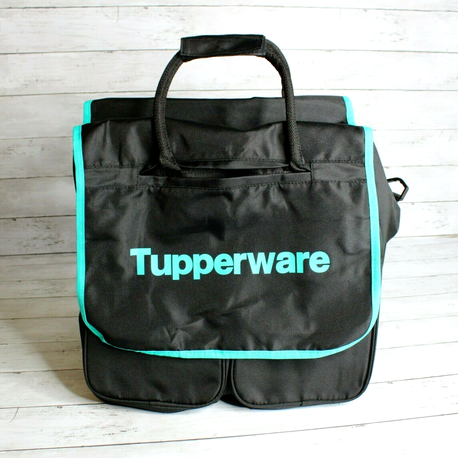 New in Package Tupperware Consultant Black & Turquoise Blue Tote Bag This listing is for one Tupperware Logo Consultant tote bag. It is large in size and measures approximately 15 1/2" wide by 17 1/2" high by 11" deep, excluding front pockets. It has attached handles and also includes a padded shoulder strap. The front has two roomy pockets It is brand new in package however please know it was removed from packaging in order to take photos. It's never been used and is in brand new condition.