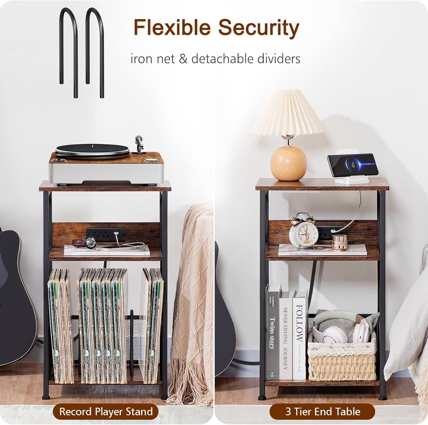 Record Table with Charging Station: This record player stand features 2 AC outlets and a USB-C port, offering a convenient charging solution for your record player, phone, and other devices Large Storage Space: This record stand features 3 layers, the top for your record player and magazines, an open second shelf for additional items, and a divided bottom space to store over 100 records of various sizes, offering ample storage and display options Compact and Durable: Measuring 15.75" W x 11.41" D x 25.59" H, this industrial record player stand is perfect for small spaces. Made of sturdy steel and planed wood, it supports up to 110 pounds, adding style and personality to your home Multi-Occasion Use: This modern turntable stand fits various rooms—living room; study; bedroom; or office. It can also serve as a bookcase; vinyl record storage; bedside table; or file cabinet, making your space cleaner and more comfortable Easy to Assemble: The record storage stand includes clear instructions and labeled parts, along with installation tools for a smooth setup. If you have any questions during use, don’t hesitate to reach out for assistance Product Description Side Table or Record Player Stand? Up To You!!! Record Player Stand with Charging Station The 3-tier record rack with dividers for sorting storage can hold up to 100 records, and the plugs can be used for record players, stereos and so on. Bedside Table with Charging Station Remove the dividers to use it as a side table, bedside table, and the changer with USB and AC outlets can be used to charge mobile phones, lamps, and watches. Record player stand feature USB port, Type C charger and 2 AC outlets keep your devices fully powered up at all times 3 Tier Storage Shelf Desktop: Record players Narrow Shelf: for storing stereos, phones Record Storage: Up to 100 records Removable Dividers The removable dividers offers more storage options, either for sorting records or everyday items. 1 Larger Storage Space 2 Multi-purpose How easy is the assembly? It's super easy to assemble. The accessories are included in the package. You don't need any additional tools to assemble this record player stand. The charging port is broken, can it be replaced? Yes, once you leave us a message, we will give you a satisfied solution! How much weight can the record player stand hold? Can it safely hold a record player? The top plate of the record player stand can hold up to 50lbs and can safely hold different types of record players on the market. Can I contact the seller if I have any questions about the product? Of course you can, if you have any questions, you can leave a message to the seller, we will reply you within 24 hours. More Different Furniture Options Add to Cart Customer Reviews 4.8 out of 5 stars 22 4.3 out of 5 stars 19 4.9 out of 5 stars 16 4.5 out of 5 stars 1,948 4.3 out of 5 stars 1,313 4.3 out of 5 stars 1,545 4.1 out of 5 stars 452 Price $31.99 $ 31 . 99 $34.19 $ 34 . 19 $34.19 $ 34 . 19 $99.99 $ 99 . 99 $109.99 $ 109 . 99 $119.99 $ 119 . 99 $65.99 $ 65 . 99 Number of Drawers 0 1 2 2 2 3 2 Color Rustic Brown Rustic Brown Rustic Brown Rustic Brown Rustic Brown Rustic Brown Rustic Brown LED Lights ✘ ✔ ✘ ✘ ✔ ✔ ✔ AC Outlets ✘ ✔ ✔ ✔ ✔ ✔ ✔ USB Ports ✘ ✔ ✔ ✔ ✔ ✔ ✔
