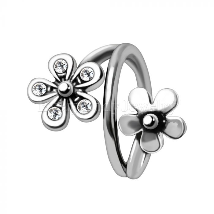 • Seamless Ring / Cartilage Earring with a Flower Design • Circular ring with twist design • Two different flower designs • Ring opens from a back side gap • Versatile jewelry can be worn as CBR, Cartilage Earring • Ring Thickness : 16GA | 1.2mm • Ring Inner Diameter : 5/16" | 8mm