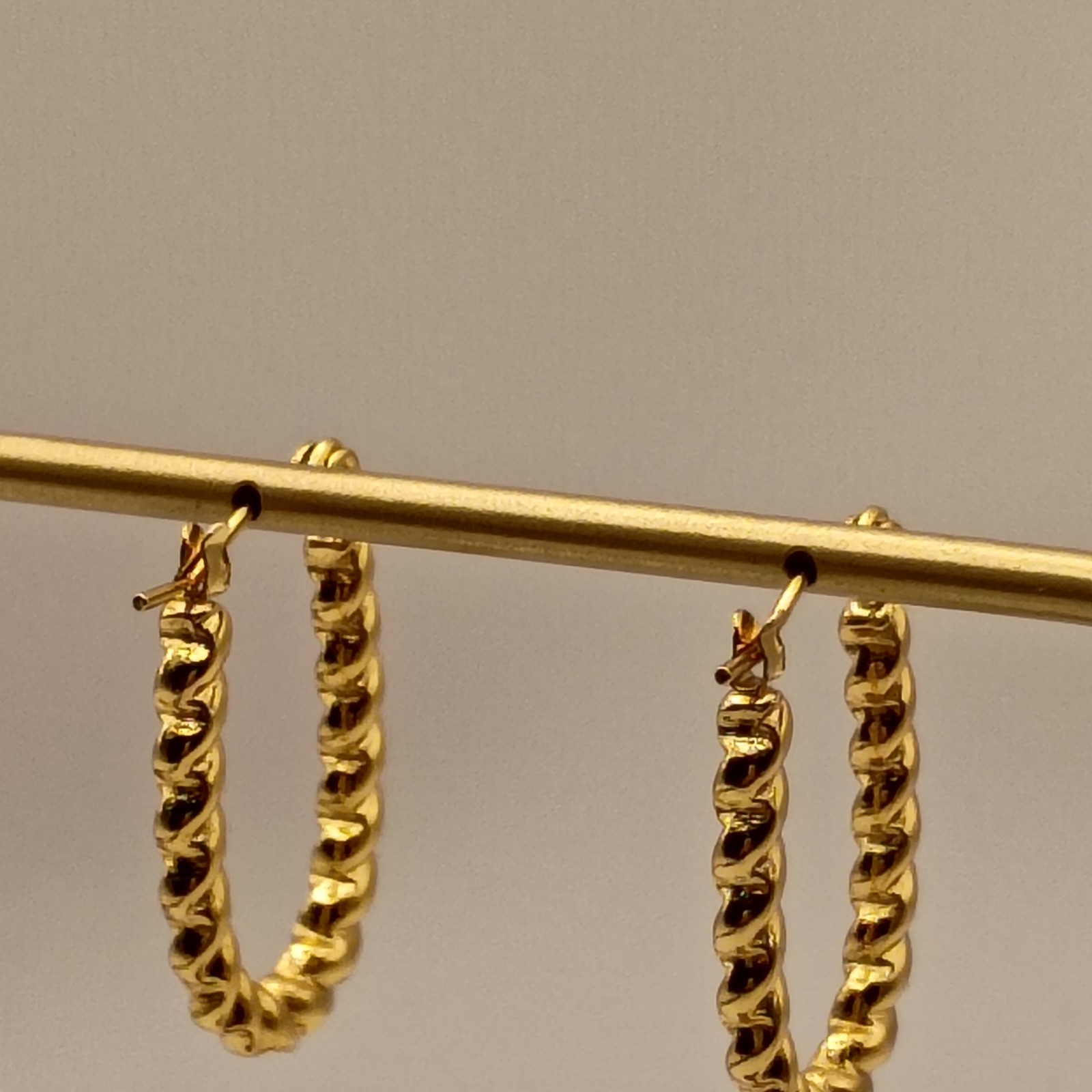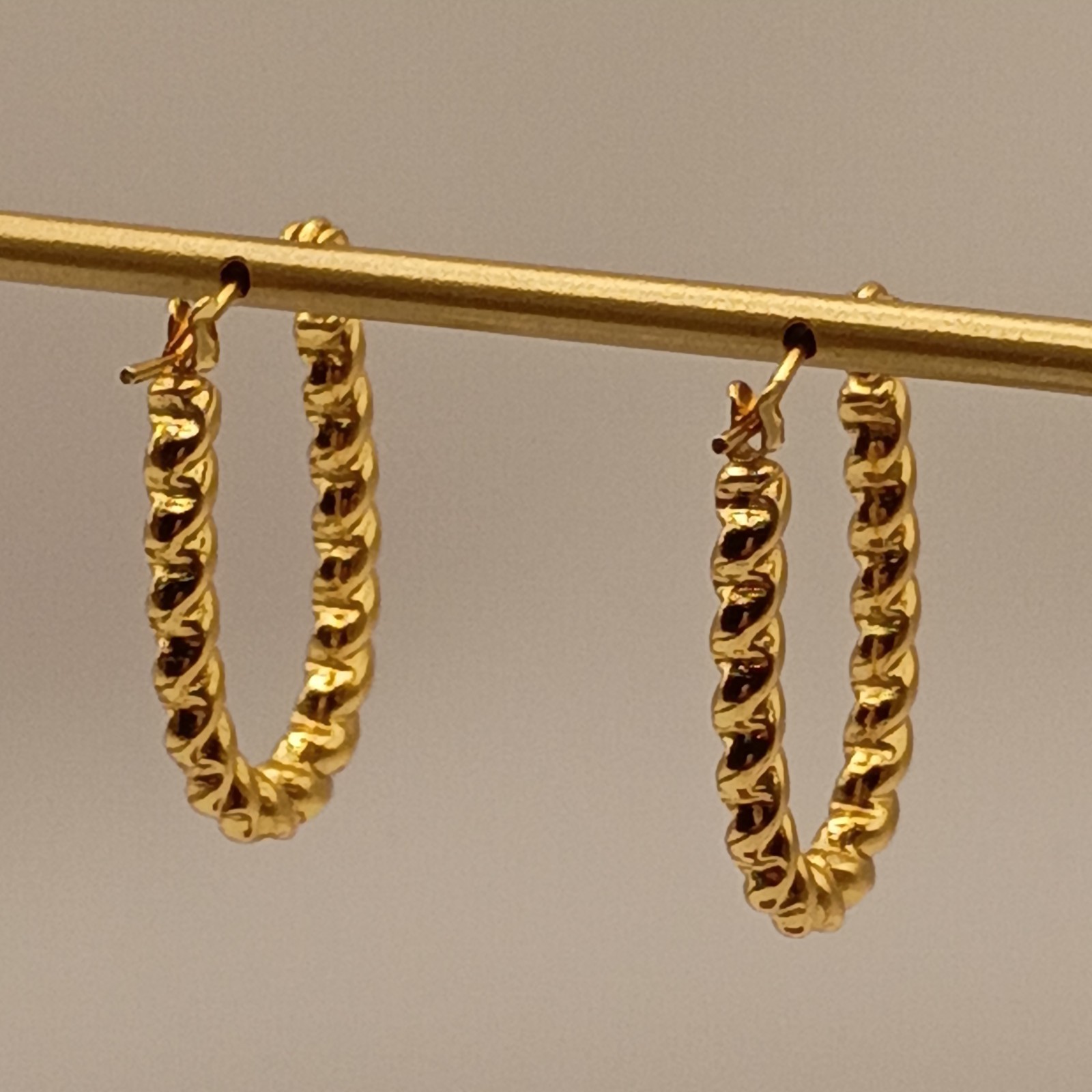 18 K Gold Plated Stainless Steel Stunning and versatile, these oval hoop earrings feature a chic twisted rope design. Made from durable stainless steel with a bright gold-tone finish, they're perfect for everyday wear or dressing up. Their classic design makes them a comfortable and stylish addition to any jewelry collection. They secure easily with a latch-back closure.