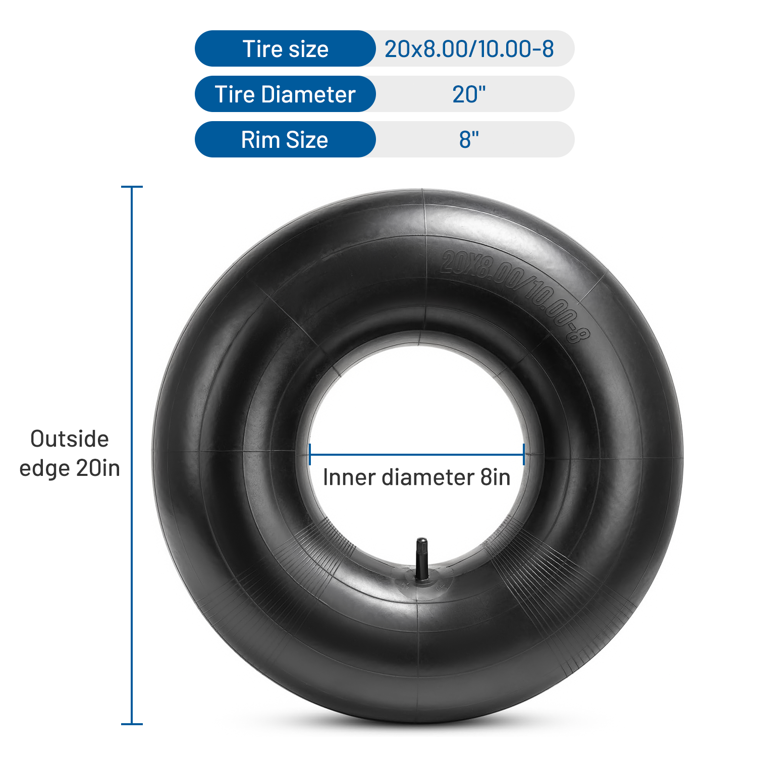 [Size] : [2-pack] The replacement inner tubes are for 20x8.00-8'', 20x10.00-8".Suitable for vehicles with 8-inch rim diameter and tire width between 8 inches and 10 inches such as 19x7-8'', 18x6.50/7.50/8.50/9.50-8'' tires (15.5" outside diameter ).The maximum psi of the 20x8x8 inner tube is 60. Please check the size before you buy it.The package include 2 compatible 20x8.00-8'' inner tubes [High Quality] : The 20x8x8 lawn tractor tire tube is made of high-quality isobutylene isoprene rubber which is better in air Tighness and aging resistance. Can provide maximum shock absorption, you need almost no maintenance [EASY INSTALLATION] : The heavy duty 20x8.00-8 lawn mower tube are easy to install. It is take probably 10min to install the 20x10-8 tube.NO special tools!Avoid overfilling during inflation [USAGE] : When a 20x8.00-8 inner tube blowout occurs, there is no need to buy a new wheel. Only need to replace the 20x8.00-8 tube, you can use it normally!The 20x8.00-8 tire inner tubes are compatible with cycling lawnmowers, tractors, golf carts, garden trailers, tillers, snow blowers, and all terrain vehicles [PLEASE NOTE] : Our company is committed to providing you with high-quality 20x10x8 inner tube, so that you can buy with confidence and use with confidence!If you have any questions, we will solve them for you as soon as possible. On Nov 27, 2025 at 23:20:28 PST, seller added the following information: