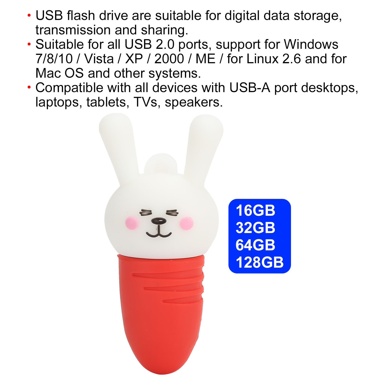 Feature: 1. Support for all USB 2.0 ports, support for 7 / 8 / 10 / Vista / / 2000 / ME / for 2.6 and for Mac OS and other systems. 2. Can be used with all devices with USB‑A port, such as desktops, laptops, tablets, TVs, speakers. 3. The flash memory is really suitable for digital data storage, transmission and sharing. 4. Using sturdy and soft plastic protective cover, which is shockproof and fashionable. 5. The is quick and easy, plug and play, the USB flash drive is no need to drive. Specification: Item Type: U Disk Material: Plastic Scope of Application: Applicable to all USB 2.0 ports, support for 7 / 8 / 10 / Vista / / 2000 / ME / for 2.6 and for Mac OS and other systems. Compatible with all devices with USB-A port desktops, laptops, tablets, TVs, speakers. Package List: 1 x U Disk 1. Our listing price includes the value of goods,packaging cost,and eort taxes,not including international duties. 2. duties,taxes,and charges are not included in the item price or shipping fee. 3. T he duties are buyers' responsibility .Please check with your country's customs office determine what these additional costs will be prior to your purchase. 4. All disputes arising from the duties will be submitted to ebay for solution. 1. Any questions, pls. contact us via ebay message or email us. We will reply your message within 48 hours. If you do not receive our reply within 48 hours, pls. post a message again because sometimes our message system may block some emails. 2. If you are satisfied with our service, pls. kindly leave us a positive feedback and give us the Detailed Seller Rating with all " 5 " in very area 3. Our aim is to provide Level Customer Service, your recognition will encourage us greatly and serve you better. We strive to keep all our customers satisfy. We will do our up most to exceed your eectations in customer service, communication and dispatching of your orders. On Jun 3, 2024 at 21:19:51 PDT, seller added the following information: On Dec 25, 2024 at 21:48:23 PST, seller added the following information: On Dec 26, 2024 at 19:32:29 PST, seller added the following information:
