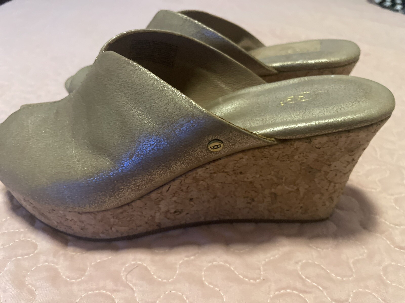 Elevate your style with these UGG Women's Tan Cork Heel Wedge Leather Sandals in size 6.5. Slip on these sandals for a comfortable and chic look, perfect for any occasion from a casual day out to a party or cocktail event. The solid brown color and metal theme make these sandals a versatile addition to any wardrobe. Crafted from high-quality leather, these sandals feature a cork outsole and a wedge heel style for a comfortable fit. The logo accents and classic product line add a touch of elegance to these slide sandals. Whether you're dressing up or dressing down, these UGG sandals are a must-have for any fashion-forward woman.Good condition