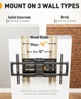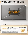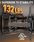 Strong & Solid: Featuring dual articulating arms and heavy-duty steel construction, this TV wall mount bracket is UL certified for its performance, durability, and safety, and can hold up to 132 lbs. The upgraded wall plate is wider for more support, while anti-drop end caps and security locks help to keep your TV in place. Wide Compatibility: The wall mount bracket fits most 42″–84″ flat or curved TVs with VESA patterns ranging from 200 x 100mm to 600 x 400mm. It’s compatible with 16″ Max wood studs, concrete, and brick walls. Doesn't fit your wood stud spacing? Please search for PGUE1 TV Wall Mount Extension Bracket to install in 24″ Max wood studs. Full Motion Flexibility: The 84 inch TV wall mount is designed with +5°/-15° tilt (no tools needed) to reduce glare, +/-45° swivel to direct the screen toward your position, and +/-3° leveling to fine tune the TV's position after installation. Bring Your TV Closer: The large full motion TV mount can extend 16.5" for viewing and retracts back to 2.9" from the wall to save space for a low-profile look. The wall plate has openings to accommodate an electrical outlet on the wall. Easy to Install: The TV wall mount comes with a detailed instruction manual, mounting hardware, and drilling template to make installation as easy as possible. Simply attach the brackets to your TV, mount the arm assembly on the wall (12″/16″ wood studs, concrete, or brick), and then hang your TV. Please do not mount on drywall alone.
