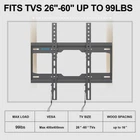 Low Profile TV Wall Mount Fits most 26-60 Inch TVs:Please verify TV VESA (the mounting hole patterns of tv back) within 75*75mm to 400*400mm and TV less than weight 99lbs. Up to 16 inch wood stud spacing. Reduce Glare: -9º tilt Angle adjustment helps to prevent reflections and glare. Saving Space: TV wall mount frees up so much floor space when your TV is on the wall.(TV back 1.3" away from the wall.) Quick lock and release: Quick disconnect pull straps help to easily remove the TV from the mount. US-Based Customer Service: Buy with confidence, we provide 10-year after-sales service. Not sure this mount will work?? Please let us know the Complete TV models. Warm tips: If you need 10X50mm concrete anchors, please let us know to get it.