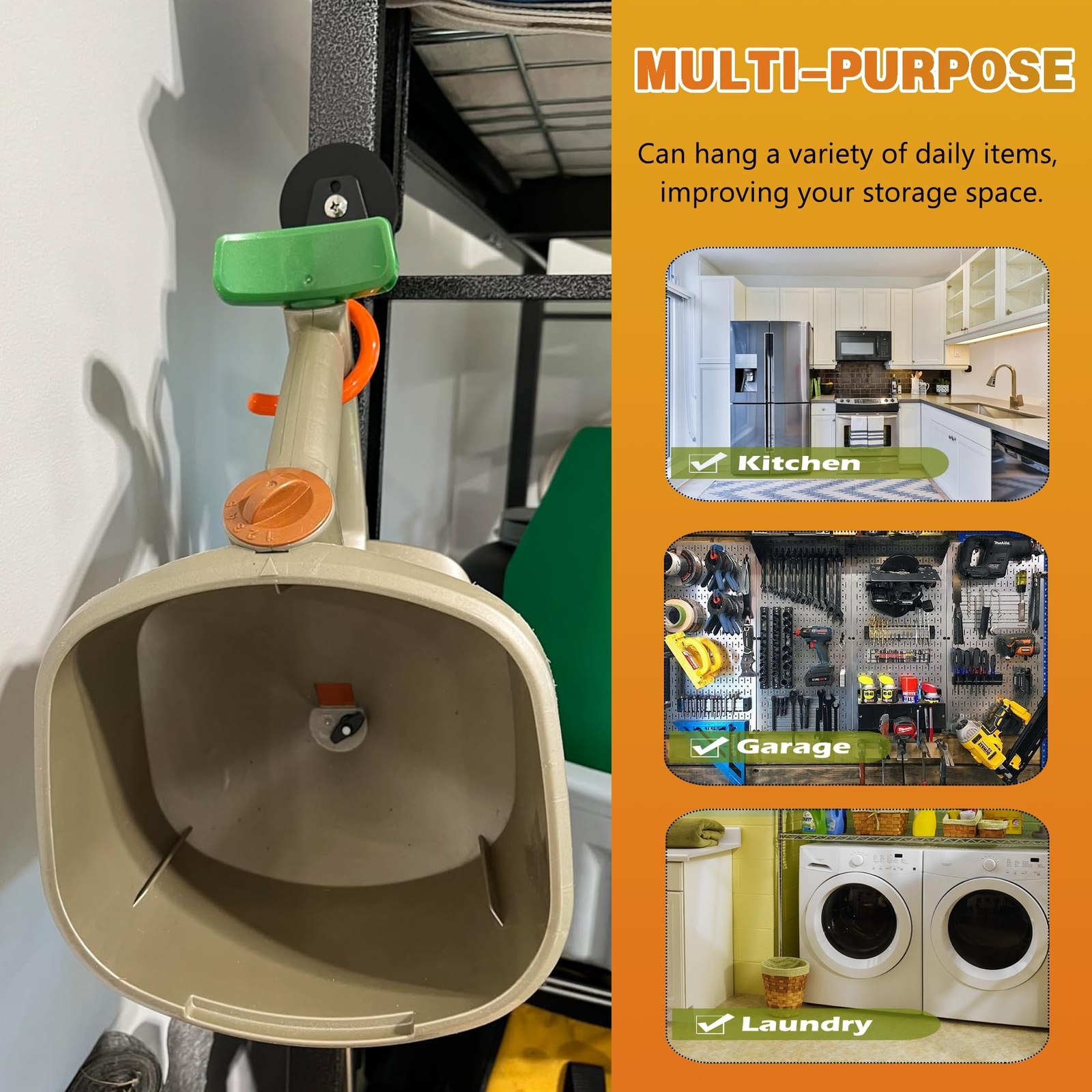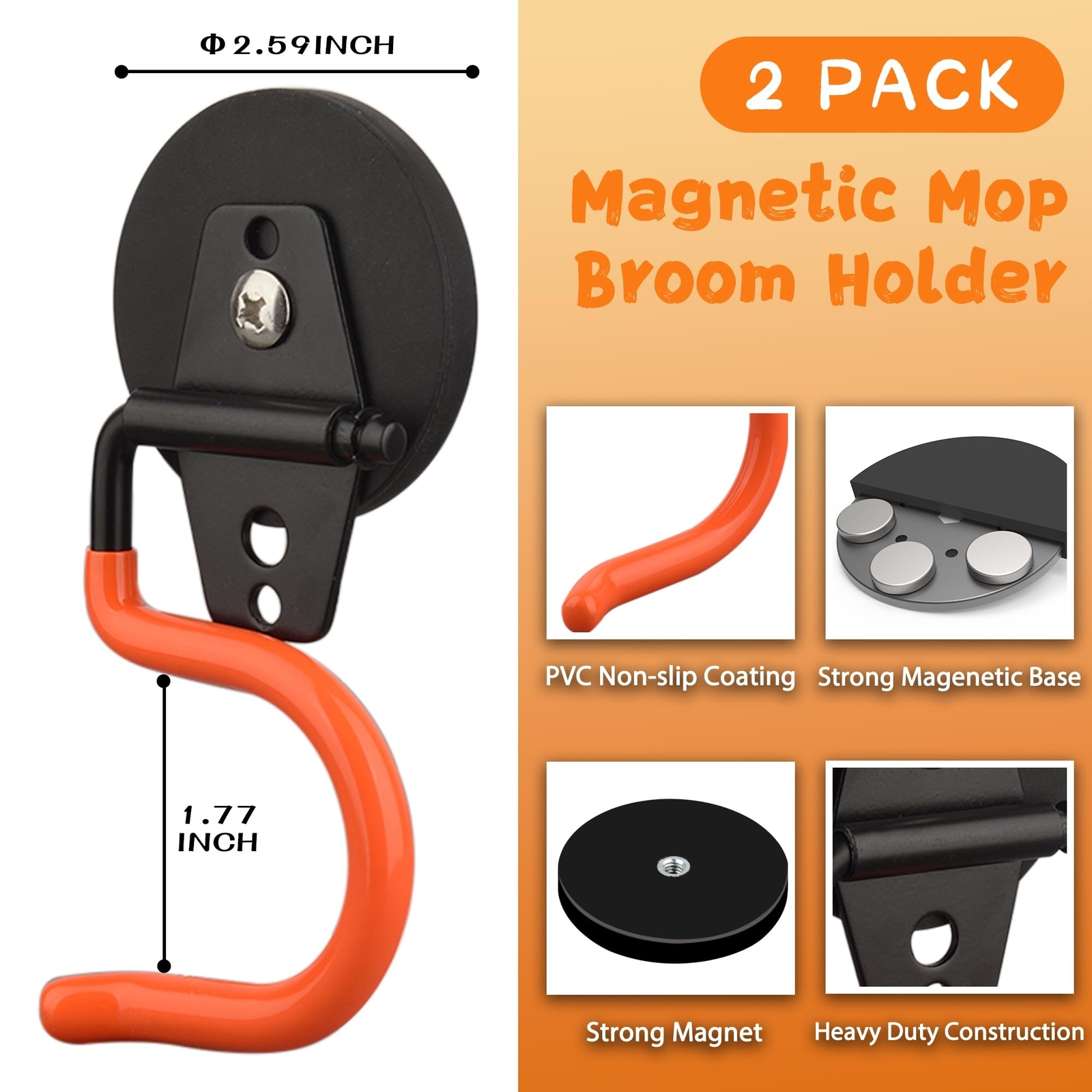 ULIBERMAGNET Magnetic Mop Broom Holder,Heavy Duty Movable Magnetic Tools Holder,Anti-Slip Strong Metal Hooks Mop Shovel Hanger for Garage, Kitchen, Laundry, Garden(2 Pack/Orange) - Buy Now with Fast Shipping! ULIBERMAGNET Magnetic Mop Broom Holder,Heavy Duty Movable Magnetic Tools Holder,Anti-Slip Strong Metal Hooks Mop Shovel Hanger for Garage, Kitchen, Laundry, Garden(2 Pack/Orange) Product Details Color: Silver Brand: ULIBERMAGNET Material: Magnet Mounting Type: Mangetic Style: 2PACK 2.59" Magnetic Mop Broom Holder Color: Silver Brand: ULIBERMAGNET Material: Magnet Mounting Type: Mangetic Style: 2PACK 2.59" Magnetic Mop Broom Holder Special Feature: Easy to Install, Magnetic, Waterproof, Adjustable Recommended Uses For Product: Garage Included Components: 2PC Magnetic Mop Broom Holder Manufacturer: Ningbo qi yi guang dian ke ji you xian gong si Item Weight: 15.2 ounces Package Dimensions: 5.31 x 3.31 x 1.85 inches Country of Origin: China Item model number: ULIMAG-66M4MopSHolder Special Features: Easy to Install, Magnetic, Waterproof, Adjustable Batteries Required?: No Date First Available: June 13, 2023 Key Features ✅ [Magnetic Mop Broom Holder]: Heavy-duty magnetic S-shaped garage hook with a strong grip for hanging cleaning tools of all sizes, such as snow shovels. You can easily adjust the position of your tools and make sure they stay firmly in place. Free up valuable floor space ✅ [Magnetic Tools Holder]: The magnetic mounting base is coated with non-slip rubber, which won't damage or scratch toolboxes, or metal cabinets. Magnet mount attaches to any metal surface. The magnetic force is strong enough to meet your daily use needs ✅ [Multi-purpose Magnetic Mop Clip]: This mop holder can be widely used for storage to keep your laundry room, garden, garage clean and tidy. From umbrellas, mops, shovels, brooms to gardening or hardware tools, we can use this holder to hold them all ✅ [Easy to Use]: This magnetic mop broom holder is very easy to install, no drilling, no screws, and can be moved at any time to keep everything within reach and organized. It is a practical solution for any home or workplace ✅ [Pakage List]: 2 pcs Magnetic Mop Broom Holder. lt's a great gift for fathers, brothers, husbands or housewarming for friends! This hook is the perfect solution to reduce clutter, increase space, keep items in order, and quickly find what you need Product Description