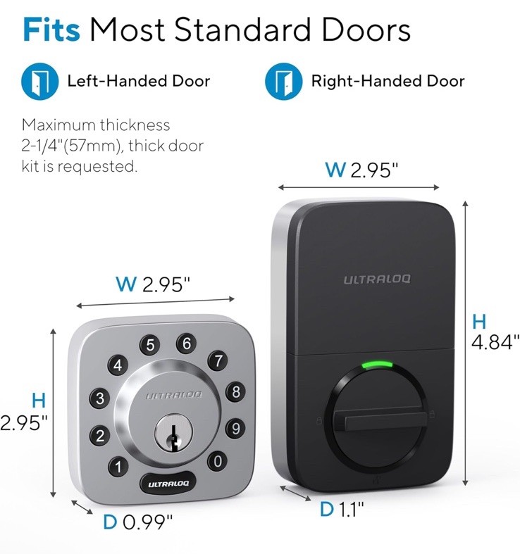 Brand ULTRALOQ Special Feature Smartphone Control From Anywhere, Auto Lock and Auto Unlock, Glove-friendly Fingerprint-resistant Keypad, ANSI Grade 1 Certified, Works with Alexa, Google, SmartThings, IFTTT, No Drilling RequiredSmartphone Control From Anywhere, Auto Lock and Auto Unlock, Glove-friendly Fingerprint-resistant Keypad,… See more Lock Type Deadbolt, Combination Lock, Keypad Item dimensions L x W x H 2.95 x 2.95 x 0.98 inches Material Zinc Recommended Uses For Product Home/Office/Airbnb/Apartment/Rental 6-in-1 Keyless Entry Door Lock: Anti-peep Keypad + Smartphone App + Auto Unlock + Shake to Open + Compatible with Apple Watch + Voice control with Alexa and Google Assistant + Works with SmartThings and IFTTT + Mechanical Key. APP Control & Share Ekeys from Anywhere: Smart locks enable you to lock, unlock, manage access rights, view access logs of who's entered and exactly when they did remotely using smartphone App and authorize family members, guests, or tenants to unlock doors using the app via Bluetooth or WiFi. Additionally, they allow for password setting and provide convenient access management. Connectivity: 2.4GHz WiFi only. Auto Lock and Auto Unlock: Smart Lock automatically locks on a preset timer and unlocks when you arrive at your door with your smartphone in your pocket. Utilize the "ULTRALOQ" button on your keyboard to "One Touch Lock". Low battery alert via app. Add random digits to protect your passcode from prying eyes. With the backlit keypad, entry your home easily even at night. Certified Highest Security and Durability: Meets ANSI Grade 1 Standard. Proven for up to 35 times strength of standard residential locks along with a 7 times longer lifespan. IP65 rated dust and weatherproof external Smart Lock built to withstand heat and cold. DIY Installation: ULTRALOQ Smart deadbolt fits on most US standard left-handed or right-handed doors. Replace your current deadbolt with just a screwdriver in 10 mins. Backed by Ultraloq, world’s leading smart lock brand with more than 1 million happy American users.