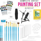 A complete premium quality 46-piece artist painting set that contains everything an artist needs to create their masterpieces! It contains premium professional-grade vivid paint colors, an essential assortment of brushes, canvas painting panels, a watercolor pad, an easel, and all the tools and accessories needed to create amazing artwork! Aspiring artists, art students, and professional artists love using this fun, safe, and easy-to-use painting set! This set includes all the essential components that every level of artist needs to be creative and practice all the standard painting techniques. The superior performing artist acrylic and watercolor vivid paint colors will bring your artwork to life, as they are easy to use and provide outstanding visual artwork results. Our acrylic and watercolor paints are kid-safe as they are non-toxic, water-based, acid-free, and conform to ASTM D4236 and EN71. The durable adjustable 15" to 21" high black aluminum tabletop easel securely holds the canvas panels, so you can easily draw with the included pencils and paint with the brushes and palette knives. U.S. Art Supply is a national industry leader in Art Supplies. Buy with Confidence: Backed by a trusted brand dedicated to your satisfaction, we ensure a hassle-free experience every time.