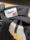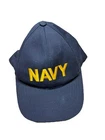 Preowned in Very Good Condition US Navy Blue/Gold Military Hat is a baseball cap made in the United States. It features an embroidered design with a camouflage pattern and the US Navy logo in blue and gold. The hat is adjustable and suitable for travel, casual wear, and workwear.