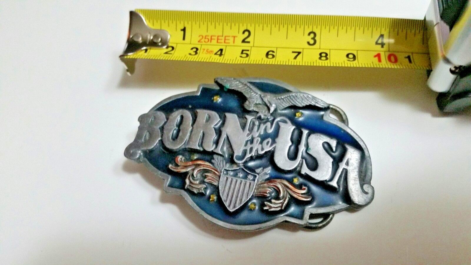 Great quality belt buckle made by SISKIYOU Buckle Company made in the U.S.A. and has "Born in the USA" images debossed and enameled on the front of Brass. Usually ships in 1-2 days with tracking number provided. Thanks for looking, please contact me with any questions. All items are stored in a smoke free home.