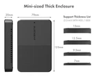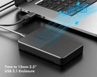 15mm, 12.5mm, 9.5mm and 7mm Thickness USB3.1 Gen2 10Gbps SuperSpeed to Host PC SATA III 6Gbps Connection to 2.5" HDD / SSD Tool-free and easy Plug & Play Installation USB Type-A Cable and USB A2C Adapter Specifications Model: EL-15C Internal Interface: SATA III/II 6Gbps USB Port: USB3.1 Gen2 10Gbps Material: PC Plastic Dimension: 123*79*20 mm OS Compatibility: Windows, Linux, Mac OS Compatibility Note: 1.This box supports 2.5-inch, 5Volt, SATA hardisk only! 2.Not fit SAS disks like Seagate Enterprise Performance, WD Xe WD4501BKHG and some models came from HP, Dell, IBM servers 3.Not fit WD VelociRaptor or Seagate Constellation which takes 12Volt power. For example, WD3000BLFS and ST2000nx0243 are not on the supported list Packaging: 1*EL-15C Hard Drive Enclosure 1*10Gbps USB C2A Cable 1*USB A2C Adapter 4*Supportive Gaskets The enclosure works with thick 2.5-inch SATA hard drive and SSD. The thickness can be up to 15mm / 0.59-inch. It’s compatible with 7mm, 9.5mm and 12.5mm standard HDD/SSD. 10Gbps USB 3.1 Gen2 to host PC and 6Gbps SATA III internal interface. Mini-sized dimensions: 123 x 79 x 20 mm Tool-free and Plug & Play installation. Small air ventilation holes around the body for better heat dissipation. Blue LED indicator shows working status. Support UASP and optimized for SSD and SSHD. Works with PC, Mac, Desktop, Laptop, Xbox, PS5, PS4 Pro and Slim gaming console. Windows, Linux, Android, MacOS multiple OS. USB Type-A cable and USB A2C adapter included Works with high capacity in 15mm form factor: BarraCuda 5T ST5000LM000, 4T ST4000LM024 and 3T from Seagate and WD Blue WD20NPVZ etc., and standard 7mm, 9.5mm SSD made by Crucial, Intel, Samsung, Kingston, Plextor etc. (Note: The case will not fit either SAS disks or HDD which takes 12V power!) What’s in the box: 1*EL-15C Hard Drive Enclosure; 1*10Gbps USB C2A Cable; 1*USB A2C Adapter; 4*Supportive Gaskets; User Manual