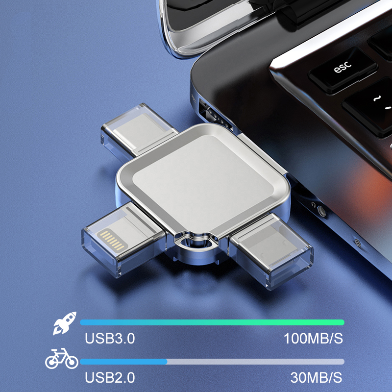 Protect File Privacy: The USB flash drive supports setting password and fingerprint protection to encrypt the information in the file to minimize the risk or avoid other data loss. By downloading the "CooDisk" app, you can move, copy, delete, encrypt your data or share your photos on various social media directly from the app. Watch Videos Directly: Store your favorite movies or music downloaded from websites on your flash drive and watch them anytime, anywhere. Media Formats Supported: Music: M4A / AIFF / CAF / MP3 / WAV Image: GIF / JPG / PNG / JPEG Video: AVI / FLV / M4V / MKV / MOV / MP4 / RMVB Document: DOC / PPT / XLS / XLSX / PDF / HTML / TX About this product 4-in-1 Multi-function Interface】The flash drive has four interfaces (Smartphone USB + micro USB + Type C + PC USB), which is more convenient for data transfer between different devices, thus getting rid of the hassle of data cables and allowing you to switch storage easily. (To use storage expansion on i OS, you need to download the "CooDisk" app; Android phones need to enable OTG function, no need to download the application.) Privacy Protection】The 4-in-1 USB flash drive provides full privacy protection and supports partial or full file encryption. Encrypted files will not be displayed on the computer. Share files, photos and videos with colleagues and friends without worrying about privacy leakage, providing you with a comfortable and secure experience. ONE CLICK BACKUP】With this flash drive, you can easily backup your files, photos, videos and phonebook on your mobile phone with one click through the app, eliminating the hassle of pasting and copying, and you can also use the USB port to store your own data backup on your computer as a double insurance. (Android mobile phones need to turn on the OTG function, no need to download applications.) [STABLE & HIGH SPEED TRANSFER] The USB 3.0 Memory Stick uses a high quality chip to ensure fast and stable data transfer, allowing you to transfer photos, videos and files in seconds. With faster transfer speeds than the regular 2.0 version and better performance than regular traditional USB storage flash drives, this USB saves time and gets more done. Portable Streaming】The USB memory stick has a metal hole so you can attach it to your backpack. 256GB of storage space lets you watch movies/play music directly on the flash drive, and you can also share photos and videos taken on Facebook, Twitter and other social media to share beautiful moments. Note: Products with power plugs are designed for use in the United States. Sockets and voltages vary from country to country, and this product may require an adapter or converter for use in your destination country. Please check compatibility before purchase. Please note: 1. For i os devices you need to download the application "CooDisk", you can search for the application from the App Store. 2. Android phones must support OTG function to be applicable. If there is no OTG function, it may not be applicable. In addition, Android phones do not need to download software, as long as the phone supports the OTG function. 3. Do not frequently pull out the memory stick during use to avoid damage. 4. Do not plug in the memory stick when the device is charging, please pull out the memory stick. 5. It should be noted that due to different factory algorithms, the actual capacity will be slightly smaller than the displayed capacity. This is normal, please don't worry.