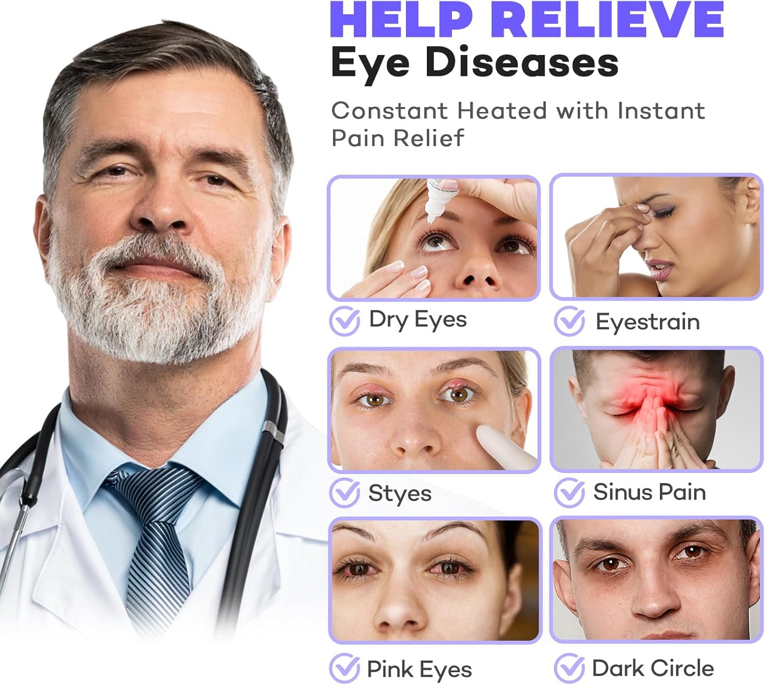 Efficiently Relieves Eye Strain: Equipped with advanced electric filament heating elements, this eye heating pad warms up quickly to provide continuous soothing heat and hot compresses for tired eyes, thus effectively relieving dry eyes, puffy eyes, dark circles, migraines, stye eyes, sinus pain, pink eyes.With the upgraded heat conduction feature, we set the temperature more suitable for soothing the eyes and recommend using it 2 times a day for 20 minutes each time Ultra Soft & Lightweight: Made of cotton and nylon fabric, ultra soft and lightweight, fits the contours of your eyes and ensures that there is no feeling of pressure during wear. With good breath ability to ensure that the eye relaxes in a warm and comfortable environment, even in the summer without a stuffy feeling Easy to Charge and Portable: Equipped with a longer 75-inch cord ensures that you can charge the eye mask more conveniently in different locations, improving the convenience of use. Compatible with regular 5V/1-2A USB outlets, it can be easily powered through any USB port, rechargeable battery, cell phone charger, laptop. Meanwhile, a delicate storage bag is included, just put it in the storage bag to carry and use it anytime and anywhere, suitable for home office and travel use Uniform Heat & Adjustable Temperature and Time: It is shaped with 3-level heat temperature from 113℉ to 131℉ and a 4-level timer of 15-60mins. Scientific studies have shown that temperatures between 104°F and 131°F are best for relieving eye muscle tension and eye strain. Our eye mask temperatures are scientifically shaped to stay in the ideal temperature range, and with personalized temperature settings, you can adjust it to your preferences for a completely customized moment of eye relax Washable and Adjustable: Easy to clean, enduring, and not affected by dirt. The adjustable headband provides a comfortable and elastic wearing experience, suitable for different head sizes Tips: 1.Hand wash with mild detergent, water temperature<40 ° C, to avoid strong friction and bleaching. 2.Hang or lay flat to dry, ensure complete dryness before use. Do not trumble dry or iron Wonderful Present: This heated eye mask is suitable for all ages, from white-collar workers to students to drivers, it is an ideal present choice. It is not only the product, but also your warm heart to care for others Product Description Recommendation Combat Dry Eyes Relieve headache Alleviate Eye Fatigue Improve Work Efficiency Enjoy Anytime, Anywhere 1 Adjustable Strap 2 Nice Present 3 Packing List