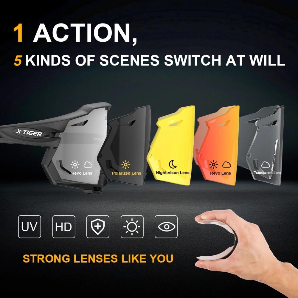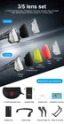 The accessories of 3 Lens 1 * TR90 Glasses With Revo Lens 1 * Clear Lens 1 * Black Polarized Lens The accessories of 5 Lens 1 * TR90 Glasses With Revo Lens 1 * Silver Crystal Lens 1 * Clear Lens 1 * Night Yellow Lens 1 * Black Polarized Lens Extra Accessories 1 * EVA Glasses Case 1 * Glasses Bag 1 * Glasses Clean Cloth 1 * Polarized Test Card 1 * Myopia Frame 1 * Silicone Strap 1 * Silicone Temple Tip 1 * Black Lower Frame Different Lens Different Uses Structural Analysis 1 Glasses For 3 Styles Makes movement smoother and clearer Suitable For Many Scenes Large View The integrated lens has a wider field of vision and a refreshing visual impact. Adjustable Silicone Nose Pads The nose pads can be adjusted freely according to the individual's face shape. Facial Engineering Design Without Pinching Your Face Temple spacing about 145MM±5 TR90 lightweight Material The whole pair of glasses only 33g 5 Functional Lenses