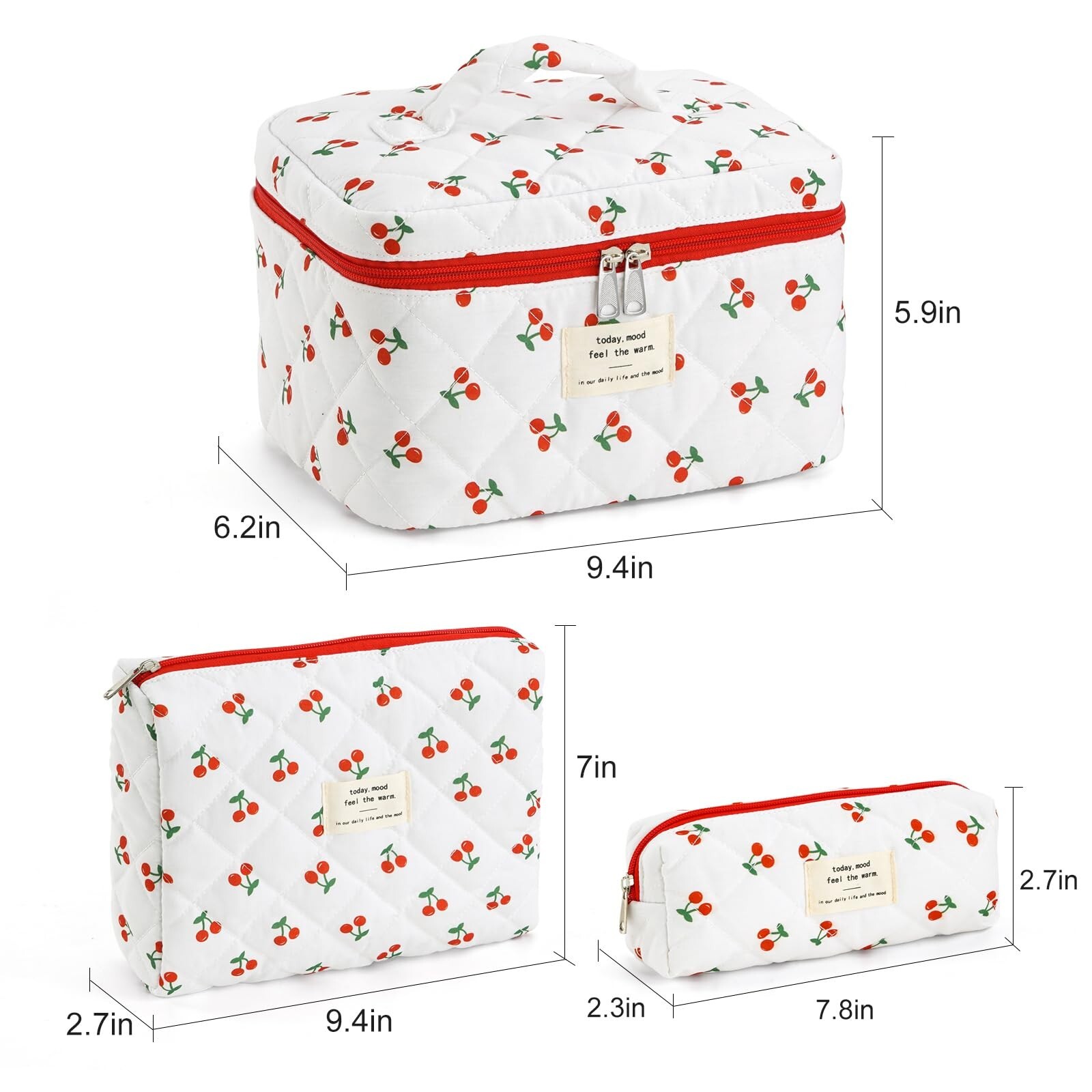 UYUUY Makeup Bag for Women 3PCS Quilted Cotton Make Up Bag Travel Cosmetic Bag Large Makeup Bag Set Cute Makeup Bag Organizer Floral Toiletry Bag Makeup Pouch for Purse, Cherry Product Details Color: Cherry Brand: UUYUUY MPN: UUYUUY Quilted Cotton Makeup Bag UPC: Does not apply EAN: Does not apply Product Dimensions: 8 x 5 x 1 inches Item Weight: 11.3 ounces Department: Womens Manufacturer: UUYUUY Country of Origin: China Item model number: UUYUUY Quilted Cotton Makeup Bag One Set Fit Most - This floral cotton makeup bag set is the perfect travel companion, offering spacious organization and easy portability. The largest bag measures 6" x 6" x 9" and can hold lipsticks, cosmetics, makeup brushes, skincare products, toiletries, tech accessories, stationery, watercolor pens, pencils, and more. It conveniently folds into a handbag or suitcase when not in use. Delicate Design - The UUYUUY quilted floral makeup bag combines fashion with functionality, featuring a trendy floral pattern thats both skin-friendly and soft to the touch. This stylish, comfortable design elevates any beauty routine or outing, making it the perfect accessory for daily use or special occasions. Its versatile appeal adds a touch of sophistication to your wardrobe while meeting all your storage needs, whether for home organization or travel. Versatile Usage - Designed to accommodate a range of itemsfrom cosmetics and skincare products to toiletries, electronics, or office suppliesits ideal for daily use, travel, or as a thoughtful gift for friends and family. The quilted floral pattern adds a fashionable touch, making this a practical and chic organizer. Easy to Care - Crafted from premium cotton, this quilted floral cosmetic bag is built to last, with reinforced stitching at all stress points for added durability. The easy-to-clean, wear-resistant fabric ensures long-lasting use, while the upgraded double zipper, made of high-quality gold-plated alloy, provides a smooth, effortless glide and precise alignment. Ideal Gifts - Featuring a charming floral pattern on durable cotton, its the perfect gift for daughters, granddaughters, girlfriends, or best friends. Whether for Valentines Day, Thanksgiving, Christmas, Mothers Day, Teachers Day, birthdays, or anniversaries, this stylish and practical organizer is sure to delight any recipient. No one can resist such a beautiful and useful accessory!