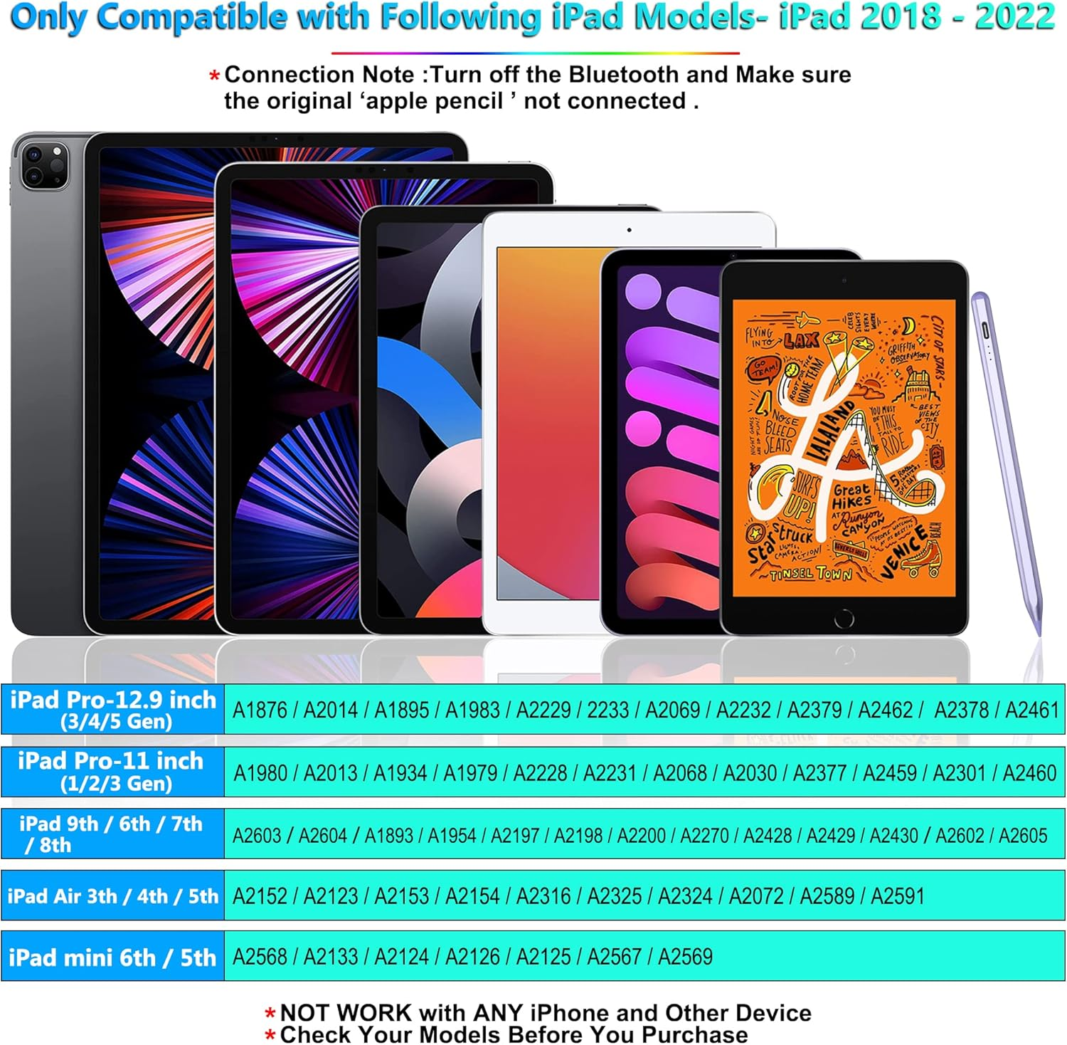 5X Fast Charge Stylus Pen for Ipad(2018-2024), Apple Pencil 2Nd Generation, Ipad Pencil Compatible with Apple Ipad Pro 11&12.9 Inch, Ipad Air 3/4/5Th, Ipad 6-10Th, Ipad Mini 5/6Th NOTE : This product is protected by Transparency, which verifies a unit’s authenticity and enables you to view rich information about the product you purchased. [ Compatible Models ]- This apple pen compatible with iPad ONLY (2018 to 2024), including iPad 9th gen, iPad mini 6th gen, iPad 6/7/8th Gen, iPad Mini 5th Gen, iPad Air 3rd/4th/5th, iPad Pro 11 Inch 1st/2nd/3rd Gen and iPad Pro 12.9 Inch 3rd/4th/5th Gen . 【Not Compatible with iPad Pro 12.9'' 1/2 Gen and any Other Models, iPhone, Android or Microsoft devices.】 [ Precise & Sensitivity ]- The stylus pen for iPad is made of Aluminum Alloy, it use a 1.5mm wear-resistant nip that can replace your finger to execute finer instructions, no lagging, offset or breaking lines, most importantly no scratches to your screen! Ergonomic design iPad stylus is an essential tool in daily work or study, only weights 13.2g even little kids can use it perfectly! [ Palm Rejection & Magnetic Absorption ]- Kailfee apple pen with palm rejection technology allows you to rest your hand comfortably on the iPad screen without glove, more naturally to write and draw just like on paper. Magnetic design makes it can attached to the side of iPad, so it won't rolling or losing when you need to rest, more convenient to use and organize. [ Touch Activated & Tilt Drawing ]- No need Bluetooth connection or App, double click the touch button on the top of the pen and start to enjoy (double click again to shut off power), Tilt and Thickening function allows you to draw different stroke of thickness and depth by altering the pencil tip inclination, perfect for drawing, writing or graffiting on iPad. [ Indicator Light & Smart Standby ]- Our iPad pencil has 3 indicator lights that can see the battery power accurately (see the detail in Product Description or the User Instruction included), automatically turn in "Sleep Mode" if idle for 5 minutes to save power. 20 hours continuous working time, 10-15 minutes charging time and 365 days standby time, no need to charge it frequently. Product Description The video showcases the product in use. The video guides you through product setup. The video compares multiple products. The video shows the product being unpacked. 1 Compatible Models 2 How to Confirm iPad Model 1 Double tap to Turn on/off 2 Upgraded Material 3 1.50MM POM Tip Game Playing Note - taking Drawing Writing Different Usage Scene Focus on Kailfee 5X Faster Charge - apple pen Purple ID706 - stylus pen for iPad Sky Blue 715K- iPad pencil Avocado 5X Fast Charge Time 10-15mins 2X Fast Charge Time 25-60mins 2X Fast Charge Time 25-60mins Double Tap to Turn on//off Indicator Lights *3→A : 5-30% AB : 30-70% ABC : 70-100% Smart Touch Active Indicator Lights *1 → Work Time : 8-10 hours Smart Touch Active Indicator Lights *1→ Work Time : 8-10 hours Item dimensions L x W x H 6.49 x 0.35 x 0.35 inches Are Batteries Included Yes Battery Average Life Standby 365 days Color 5X - purple Product Dimensions 6.49 x 0.35 x 0.35 inches Material Metal Compatible Devices iPad (2018-2024) Item Weight 13.61 g Batteries 1 Lithium Polymer batteries required. (included) Batteries Required? Yes Number of Batteries 1 Lithium Polymer batteries required. (included) 0.35 inches x 6.49 inches x 0.35 inches. Weight: 13.61 g Shipping from the USA All of our products are shipped from the USA, ensuring quick delivery to your destination. Payment We offer the following payment methods: PayPal, credit card, bank transfer, and eBay's secure payment system. Free Shipping & Free Returns Shipping within the USA is FREE. Additionally, any return is absolutely free for you. Risk-Free Purchase You have the option to return an item within 30 days without any justification. We cover the return shipping costs! Fast Shipping We ship immediately upon receipt of payment. Generally, the package is delivered within 2-3 days in the USA. If it takes longer, we will contact you. Quality and Costs Made in Europe, USA, China No customs fees or additional charges Total satisfaction guarantee Invoice with declared VAT available upon request in .pdf format Feedback Your feedback is very important to us. After you pay for your purchase, you will automatically receive positive feedback from us.