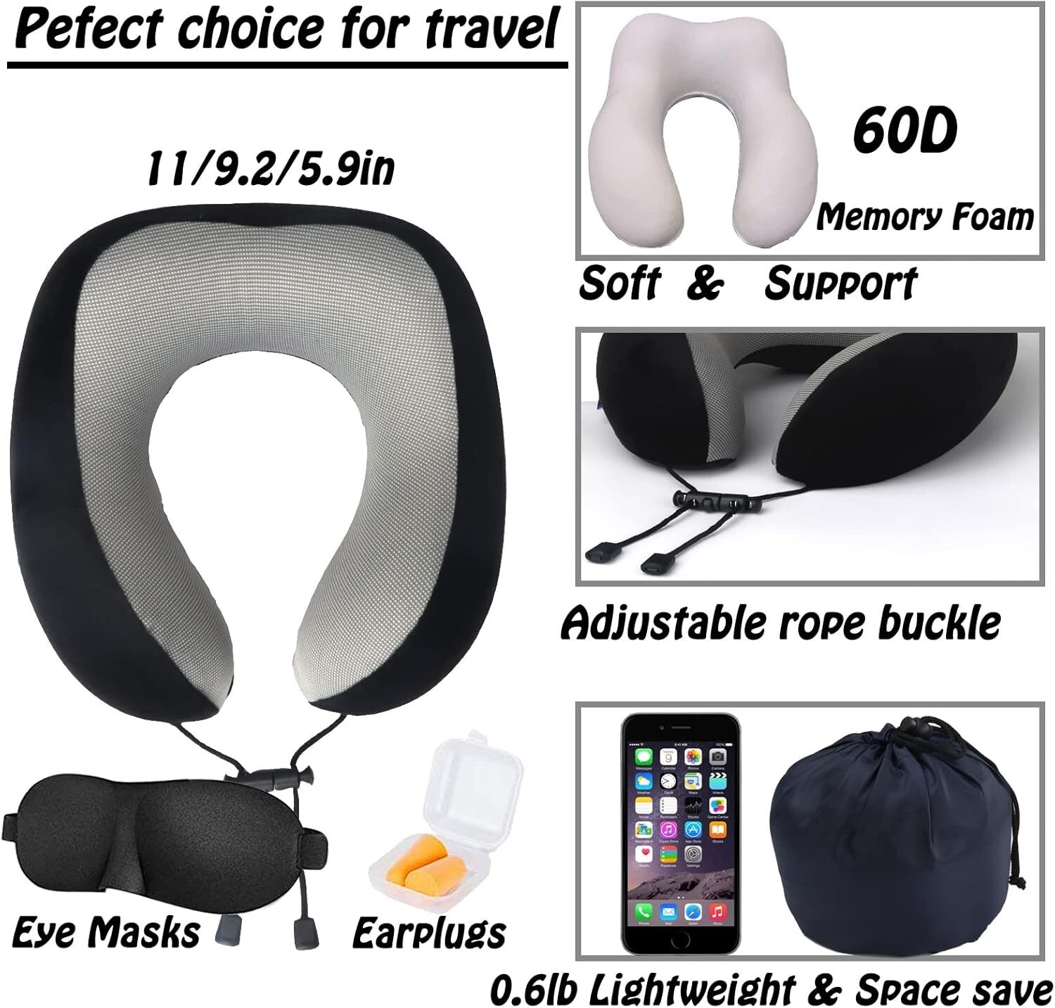 Travel Pillow,Travel Neck Pillows for Sleeping,100% Pure Memory Foam Soft Comfort & Support Pillow for Airplane/Car/Office&Home Rest Use-Black Provide Perfectly Supportive: Travel neck pillow with memory foam can better fix your neck to provided support and comfort, prevents head from falling forward, The adjustable rope lock, you can adjust the angle and the size of the pillow randomly, meeting different neck size requirements Premium Memory Foam: travel Neck pillow was made of high quality memory foam with 5 seconds return technology, soft and comfort Comfortable & Breathable Pillow Cover:Pillow cover is washable cover with breathable and super soft magnetic therapy cloth provides the maximum comfort on your trip. Light Weight(;Space Saving :The neck pillow size is " allows to compress down to a smaller size in storage bag, the weight of the package is lbs. Travel Neck Pillow was designed for portability and comfort Travel Essentials :Everyone need a high quality memory foam travel neck pillow when you on a airplane, car, train , bus. or at home & office use