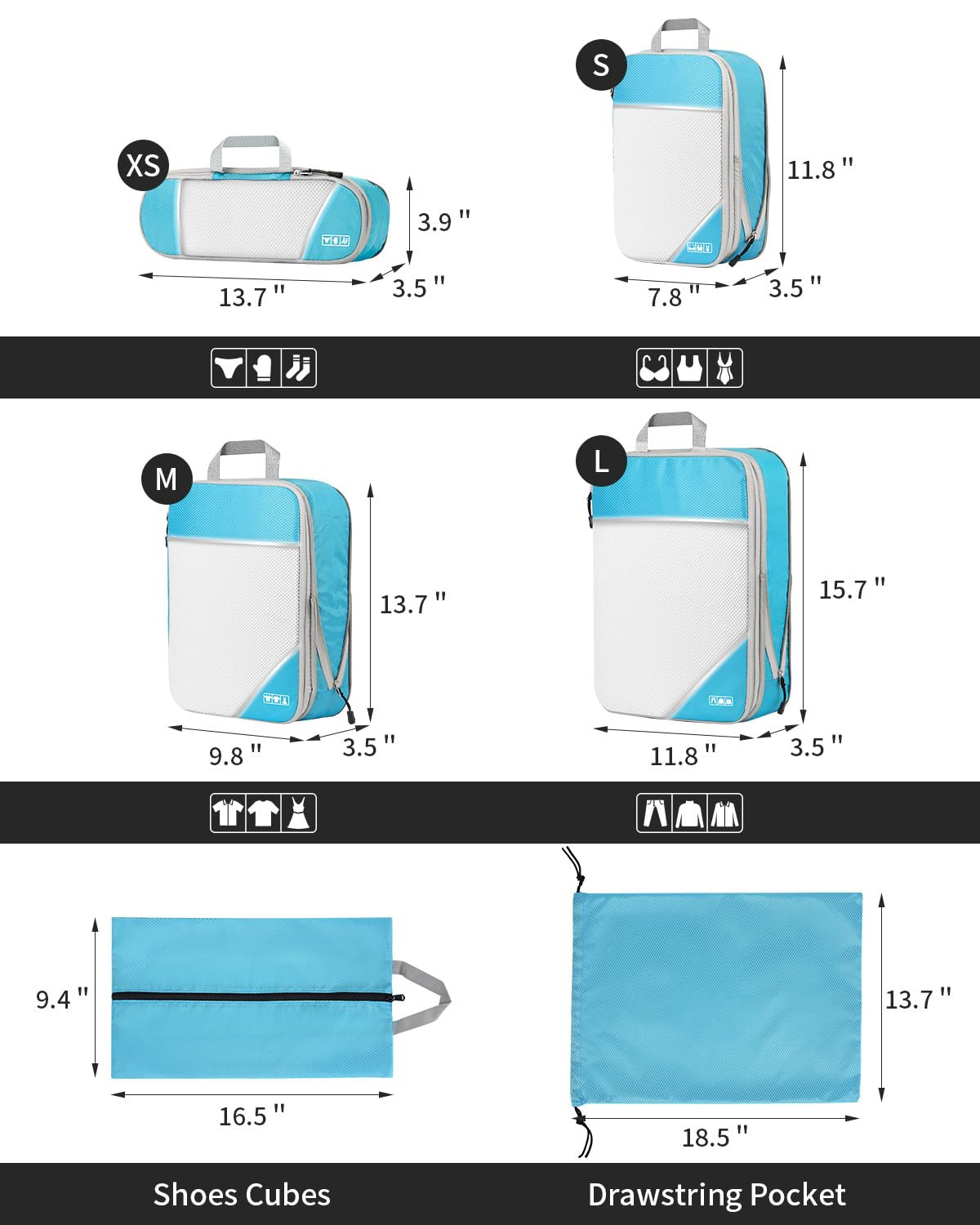【MAXIMIZE YOUR SPACE】Our compression design helps remove the extra air out, allows you to fit more into your suitcase than you ever thought possible. Simply pack your clothes, save up to 60% space by compressing the packing cubes via the exterior compression zippers, to create extra room for souvenirs or essentials. 【6-PIECE SET】Easy to find what you need without the hassle with our meticulously designed 6-piece packing cubes set that keep your clothes, accessories, and essentials neatly sorted. The expanded size:L: 11.8"*15.7"*3.5",M: 9.8"*13.7"*3.5",S: 7.8"*11.8"*3.5",socks cubes:13.7"*3.9"*3.5",shoes bag: 16.5"*9.4", drawstring pocket: 18.9"*13.3". 【PREMIUM NYLON FABRIC】Our compression packing cubes are made of waterproof ultra-soft lightweight rip-stop nylon fabric, soft and foldable, with reinforced zipper, sturdy carrying handle, and the breathable mesh with professionally double-done seams, and with quick identification signs, it is easy to pack & sort. they're designed for durability, are built to withstand the rigors of travel. 【WRINKLE-FREE PACKING】 Our compression packing cubes can help reduce wrinkles on your clothing by keeping them neatly packed, Arrive at your destination with clothes that look as fresh as when you packed them. A great way to keep organized for daily storage, business travel, backpacking, camping, hiking, rv & holidays. Use different cubes to separate clean clothes from dirty laundry during your trip. 【100% SATISFACTION SERVICE】 We will make every effort to provide customers with high quality products and satisfactory service. If you have any question before or after purchase, please email us at any time, we will solve it in your favor.