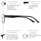 Brand New Factory Sealed (Eyewear case may need extra gluing). Photo is of the actual item. Usually ships within the same or next business day Returns accepted only if it's brand new in original condition it was sent in. 99% MORE RELAXED - Wear these round blue light blocking glasses men and women 2-3 hours before bed time, and fall asleep faster with better quality sleep by regulating your melatonin. Our 3rd party independent lab tested lenses are engineered to reduce fatigue, eye strain, headaches, migraines, dry eyes, and light sensitivity. Perfect anti-glare migraine, uv blocker glasses. SUPER LIGHTWEIGHT and COMFORTABLE - The premium quality blue blockers glasses for men and women are HANDCRAFTED using hypoallergenic acetate that's both lighweight and durable. With ergonomics in mind, the adjustable nose pads, stainless steel temples, and spring hinges make them flexible and comfortable, perfect for staring at the computer all day. Weighs only 22g, you won't even notice they're on! YOUR EYES WILL THANK YOU - Unlike other blue light blocking glasses for women and men, Umizato lenses filter out 30% blue light at 400-470nmn and 90% at 400-500nm, while also having low color distortion clear lenses. 455nm is the peak point which LED and digital devices such as tv, monitors, and smartphones emit blue light from. Our scratch resistant lenses include premium coatings for antiglare protection and oil resistance (less fingerprints and cleaning). DESIGNED BY PEOPLE WHO CARE - Umizato is a family owned business located in Southern California. We designed these blue light glasses men clear with a minimalist style in mind. They even come with a complementary modern hard shell case, and a microfiber cleaning cloth.