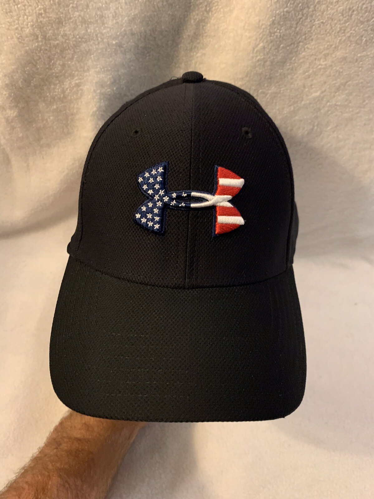 Show off your patriotic side with this sleek black Under Armour baseball cap! Made with high-quality Flexfit material, it's designed to fit comfortably and securely on your head. The hat features a solid pattern and the iconic Under Armour logo on the front. Perfect for men who want to add a touch of patriotism to their outfit, this cap is available in size Large/ XL. The color is black, making it a versatile accessory that can be worn with any outfit. Whether you're heading to a sporting event or just running some errands, this hat is the perfect choice.