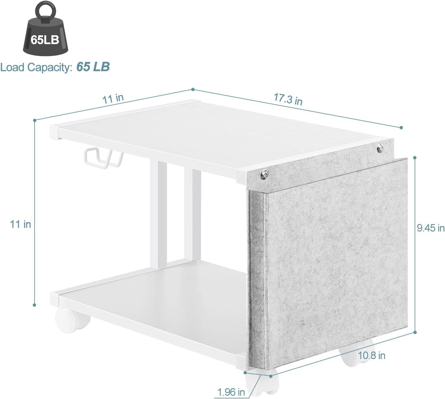 Printer Stand Under Desk Printer Table with Wheels 2 Tier Small Printer Cart with Storage Bag Desktop White Printer Stands for Home Office Fax Machine Scanner Files White 【Durable & Stable】The under desk printer stand adopts an industrial design, and the rustic and beautiful wood grain perfectly fits with the white matte paint. Heavy-duty steel frame ensures its stability, load-bearing capacity and more durable, each shelf can hold up to 65 lbs. 【Under Desk Storage】Printer stand with wheels can be used as a bookstand, storage shelf, printer holder, etc. It is good for the printer, fax machine, desktop mobile organizer, and other office supplies. It has a neat and modern look and is ideal for both home and office. 【Unique Design】The small printer table has extra file bags and hook design, which can help you store files and books, hang heads, tape measures and other tools. This will keep everything within and keep your workplace tidy. 【Practical Printer Table】The printer stand for desk is equipped with 4 adjustable feet and 4 rolling wheels (2 of them can be locked). The wheels allow you to move the white printer stand easily and the adjustable foot pads can be perfectly applied to any uneven ground and protect the floor from scratches. 【Good After-Service】We will provide you with professional customer service all the time, the printer stand under desk is applicable with 180 days exchange and full return. If you have any question, please us anytime, we will help you solve the problem as soon as possible within 12 hours. 2 Tier Movable Printer Stand with Storage The video showcases the product in video guides you through product video compares multiple video shows the product being unpacked. The home printer stands has two layers, which can hold up to 65 pounds, and can store printers, fax machines, scanners, paper, documents, books, staplers, etc.